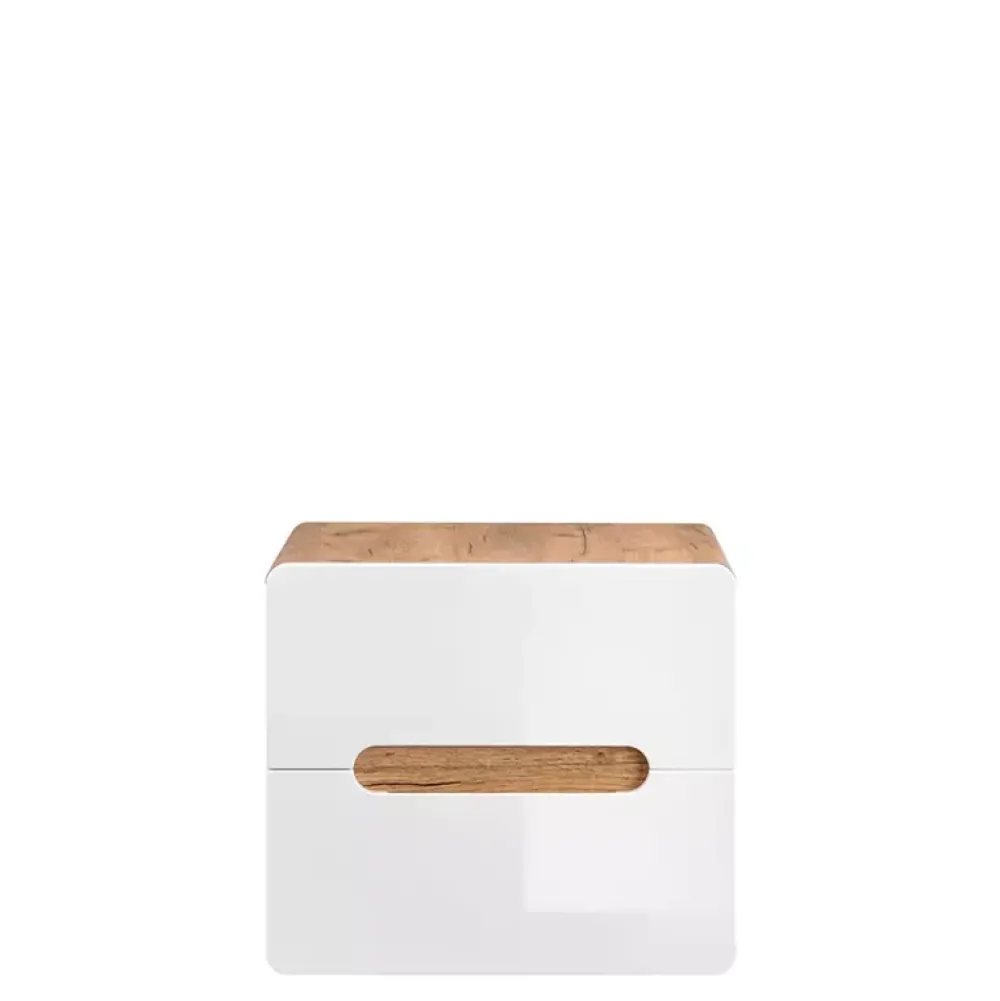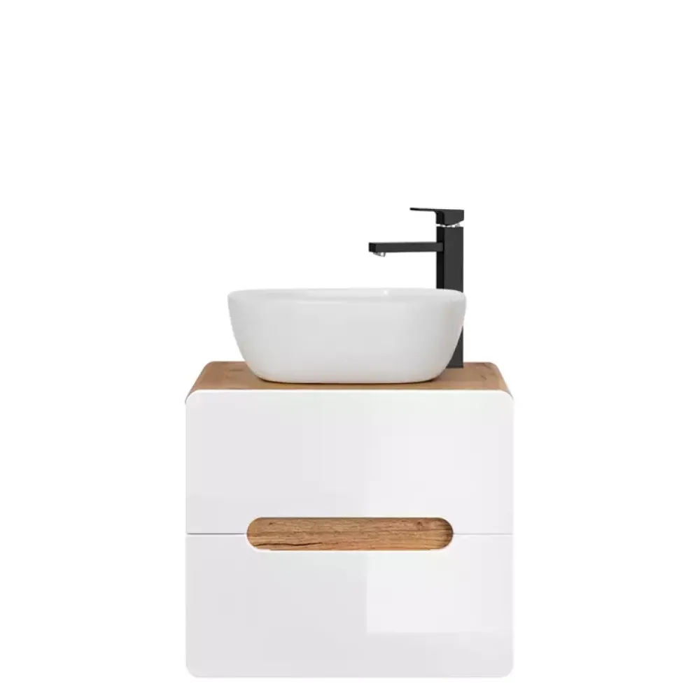 Wisząca szafka łazienkowa pod umywalkę nablatową AURELIO posiada 60 cm szerokości w skład których wchodzą dwie pojemne szuflady umieszczone na prowadnicach wzbogaconych bezgłośnym systemem cichego domyku. Dodatkowo front szafki wykonano w połysku.