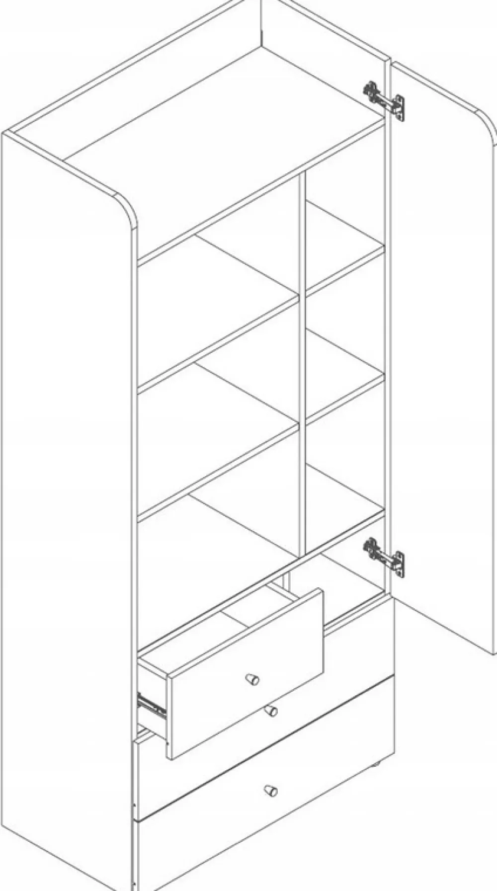 U dołu regału znajdują się trzy praktyczne szuflady, które pomieszczą wszystko – od ubrań po drobne akcesoria. Każda szuflada została zaprojektowana z myślą o wygodzie użytkowania i wytrzymałości, gwarantując długotrwałe użytkowanie bez problemów.