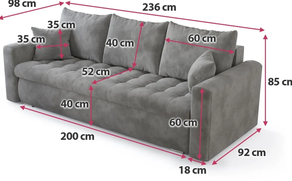 - Wymiary: szerokość 236 cm, głębokość 98 cm, wysokość 85 cm