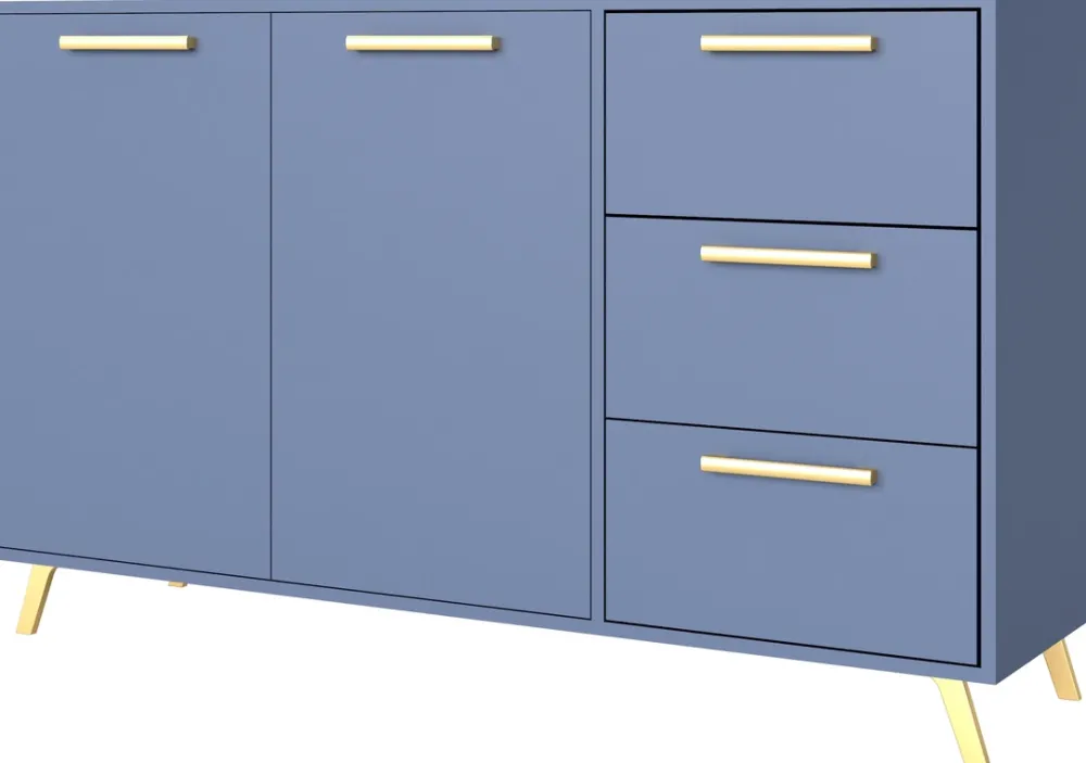 - Komoda 140 cm BILL posiada parę drzwi oraz trzy pojemne szuflady osadzone na prowadnicach rolkowych. Komoda została wykonana z płyty laminowanej 16 mm, obrzeża estetycznie wykończono okleiną PCV. Za drzwiami znajduje się półka.