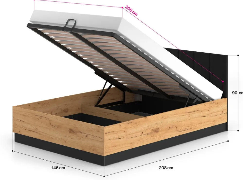 - Łóżko z pojemnikiem na pościel – idealne do przechowywania pościeli, koców czy sezonowej odzieży