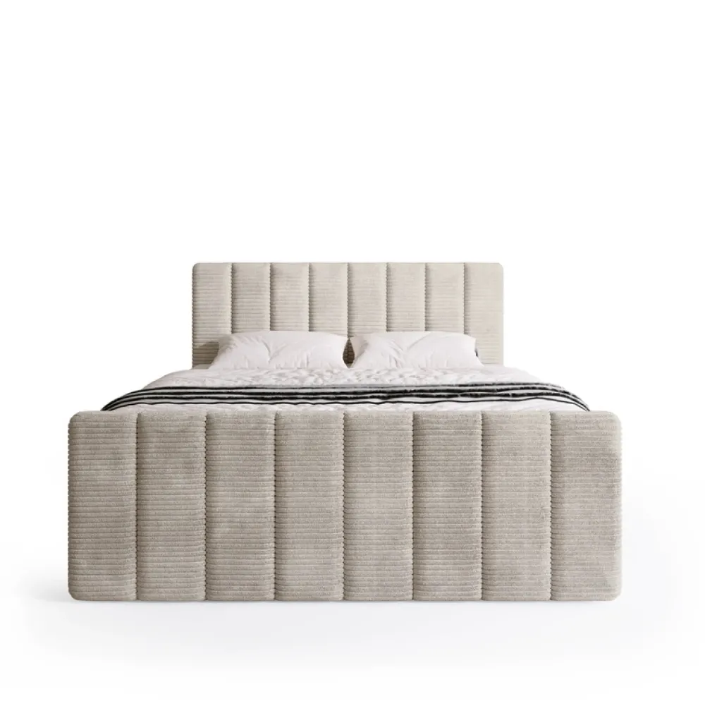 Łóżko wykonane jest w tkaninie POSO – szerokim, miękkim sztruksie o wyrazistej, prążkowanej strukturze. Materiał ten wyróżnia się wyjątkową przytulnością i aksamitnym wykończeniem, które zapewnia przyjemne doznania podczas codziennego użytkowania. Delikatne, grube prążki nie tylko dodają meblowi charakteru, ale również subtelnie zmieniają wygląd w zależności od kąta padania światła. Tkanina POSO łączy estetykę z trwałością – jest odporna na ścieranie i blaknięcie kolorów, dzięki czemu łóżko zachowuje swój elegancki wygląd na długi czas.