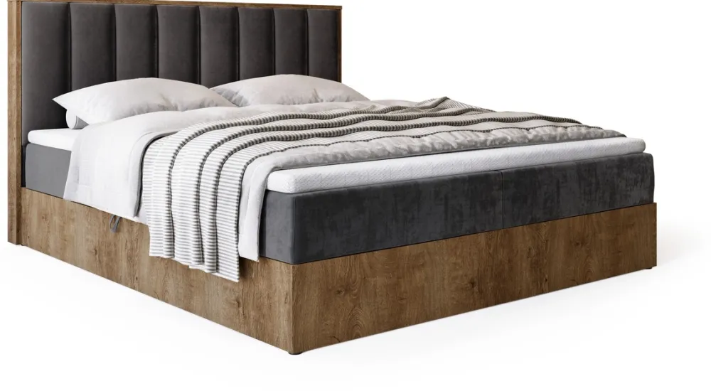 - Łóżko przedstawione na wizualizacji zostało wykonane w kolorze Dąb Lefkas oraz tkaninie Kronos 34.