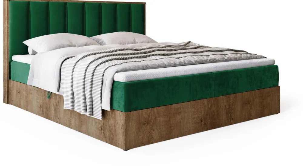 - Łóżko przedstawione na wizualizacji zostało wykonane w kolorze Dąb Lefkas oraz tkaninie Kronos 19.
