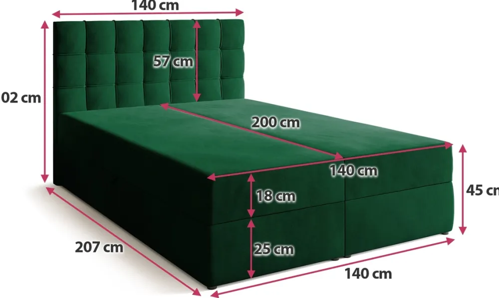 - Łóżko kontynentalne 140×200 DETROIT wykończono welurową tkaniną Kronos, która charakteryzuje się efektem pisania. Materac łózka wykonano na bazie sprężyn bonell oraz pianki T-30. Za dostęp do pojemnika odpowiada sprężynowy automat rozkładania.