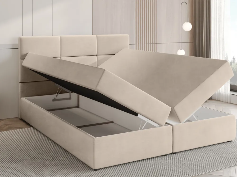 Dwa pojemniki na pościel otwierane są za pomocą sprężynowego automatu rozkładania, który przejmuje na siebie część ciężaru materaca, dzięki czemu dostęp do zawartości pojemników na pościel jest prosty oraz przyjemny.
