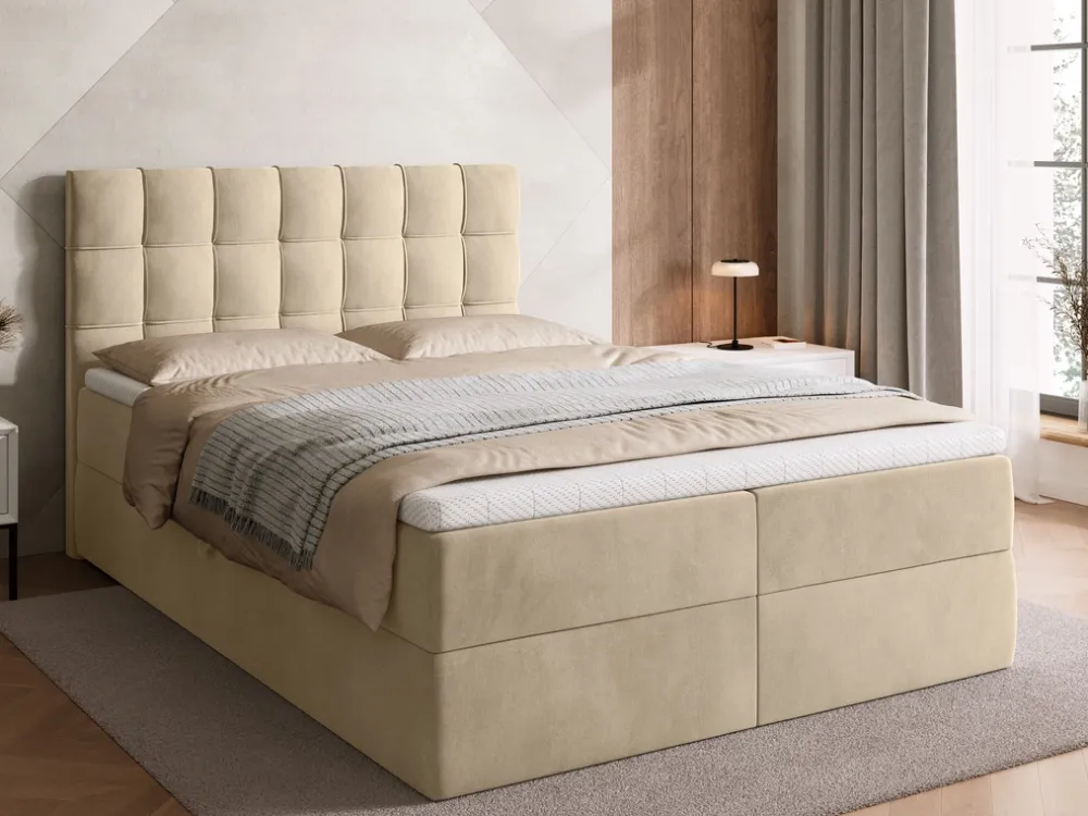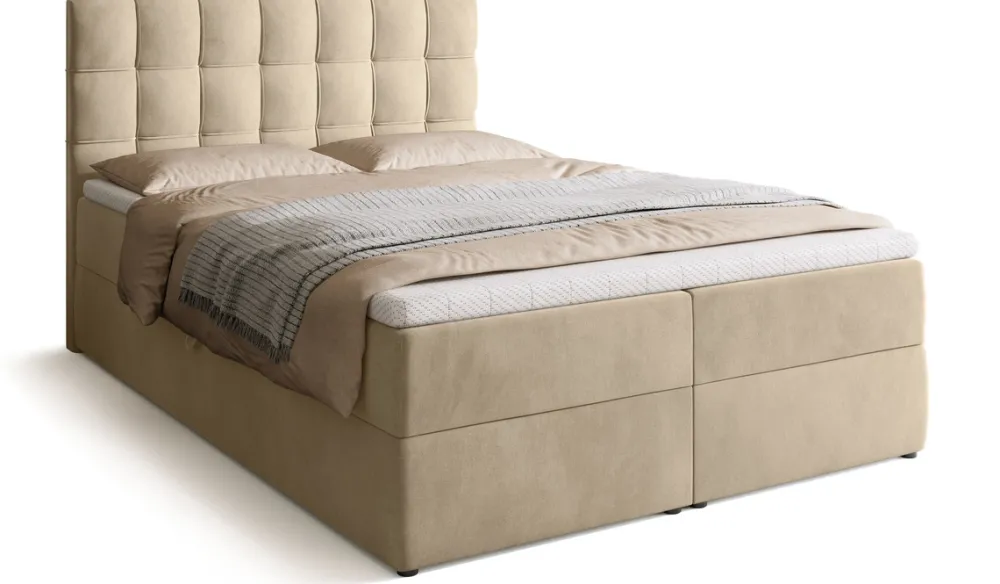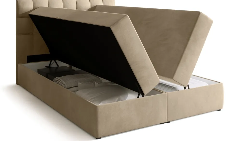 Łóżko kontynentalne do sypialni posiada dwa pojemniki na pościel, które pozwalają na przechowanie pościeli i nie tylko. Automat sprężynowy wspomaga otwieranie pojemnika, co czyni dostęp do jego zawartości prostym i komfortowym.