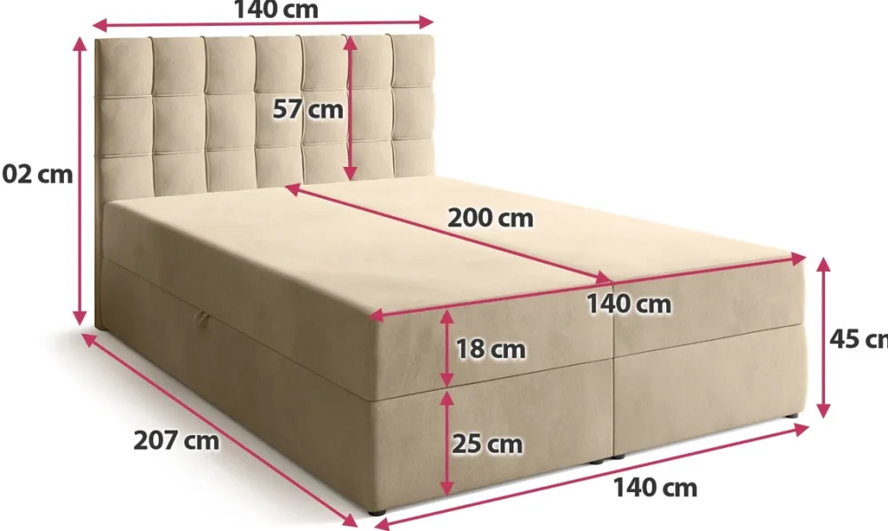 - Łóżko kontynentalne 140×200 DETROIT wykończono welurową tkaniną Paros, która charakteryzuje się efektem pisania. Materac łózka wykonano na bazie sprężyn bonell oraz pianki T-30. Za dostęp do pojemnika odpowiada sprężynowy automat rozkładania.
