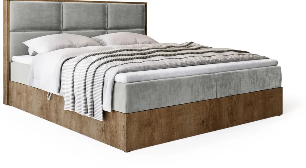 - Łóżko przestawione na wizualizacji zostało wykonane w kolorze Dąb Lefkas oraz tkaninie Paros 05.