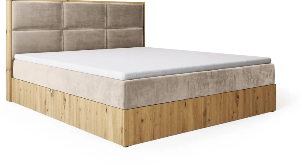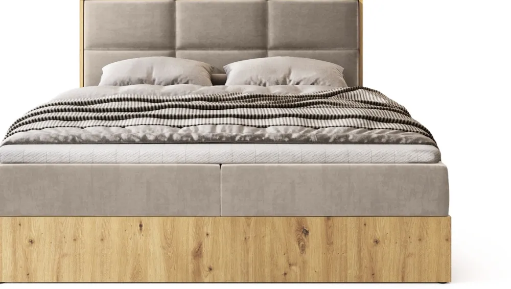 Łóżko wyposażone jest w dwa pojemniki na pościel, które są nie tylko praktycznym, ale i eleganckim rozwiązaniem do przechowywania. Dzięki sprężynowemu automatowi rozkładania dostęp do nich jest szybki i bezproblemowy, co ułatwia codzienną organizację i pomaga utrzymać porządek w sypialni.