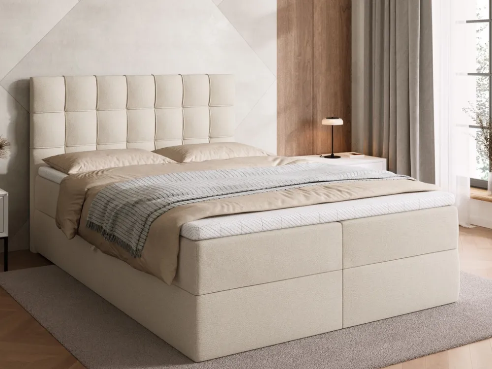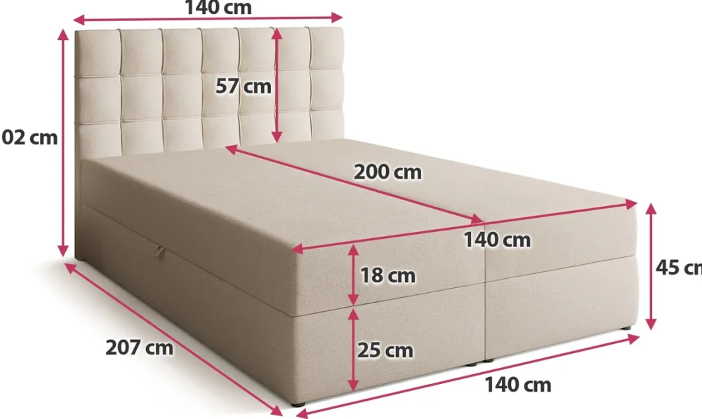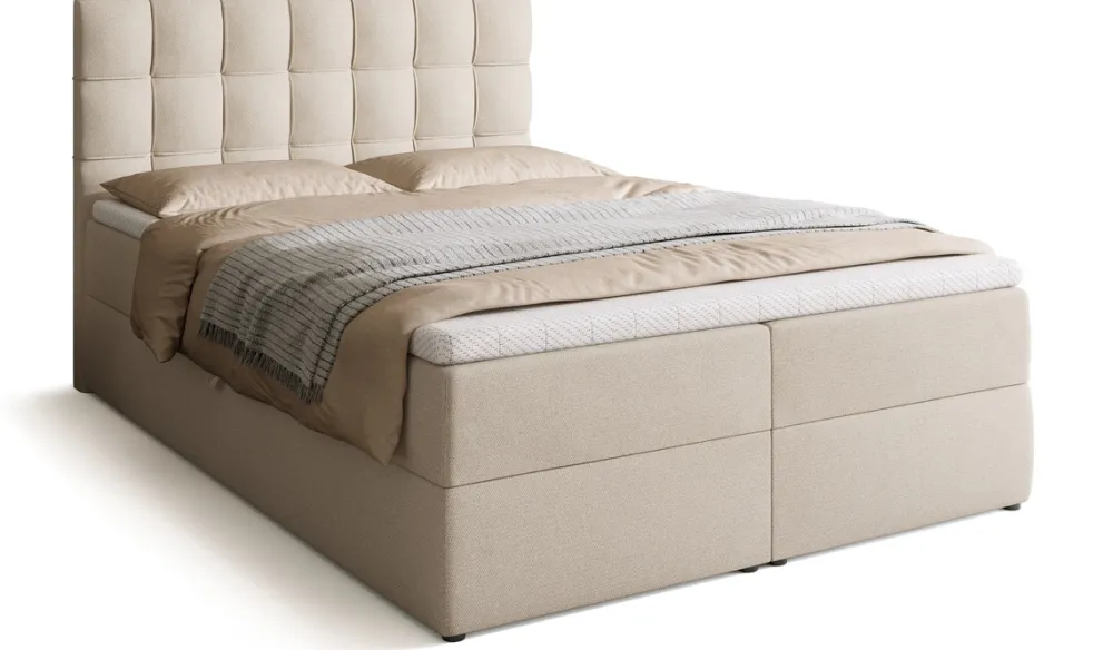 - Łóżko kontynentalne 140×200 DETROIT posiada miękki, pikowany zagłówek z widocznymi przeszyciami. Materac łóżka został wykonany na bazie grubych sprężyn bonell oraz pianki T-30. Pod powierzchnią spania znajdują się dwa pojemniki z automatem sprężynowym.