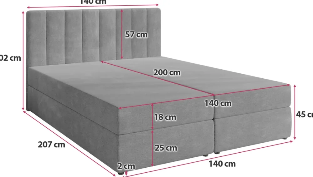 - Łóżko kontynentalne 140×200 cm DENVER zostało wyposażone w pojemnik na pościel otwierany za pomocą automatu sprężynowego. Średnio twardy materac łóżka składa się ze sprężyn bonell oraz pianki T-30, gwarantując wysoki komfort snu.