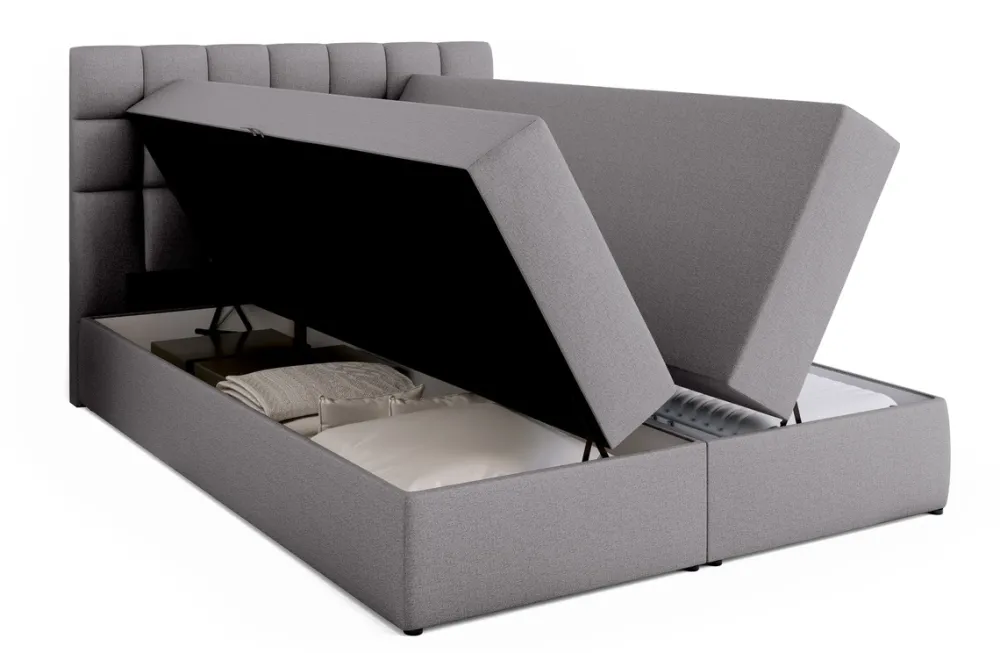 - Łóżko posiada dwa głębokie pojemniki na pościel. Za dostęp do pojemników odpowiada automat sprężynowy, który przejmuje na siebie część obciążenia, przez co znacząco ułatwia rozkładanie.
