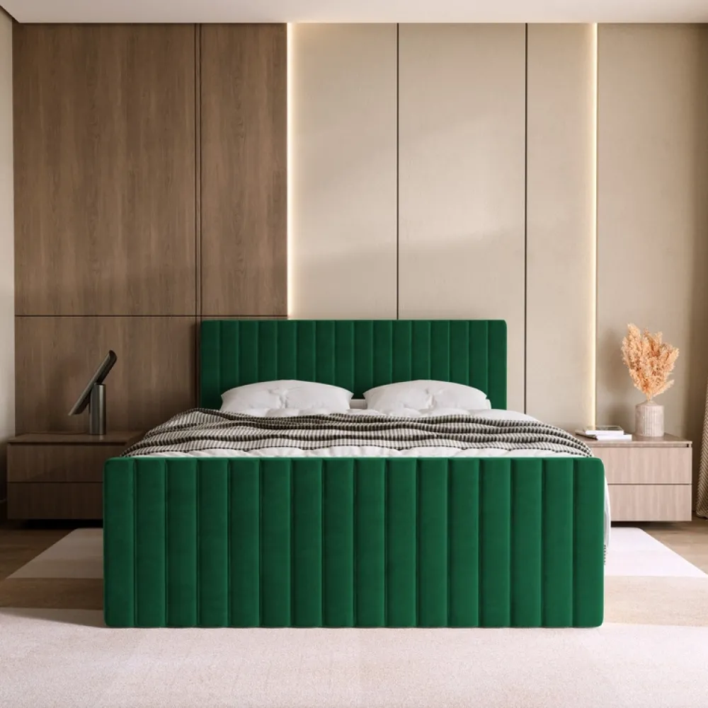 - Zielone łóżko kontynentalne DREAM DUO 140×200 cm obite welurową tkaniną Kronos 19. Wyposażone w materac ze sprężynami bonell, dwoma pojemnikami i tapicerowanym zagłówkiem. Komfortowy sen i elegancja w Twojej sypialni – idealne do nowoczesnych wnętrz.