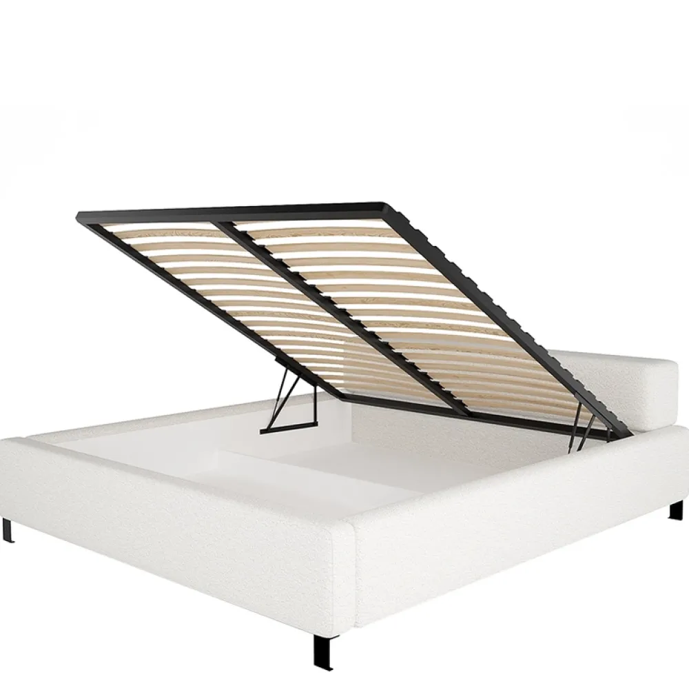 To łóżko zostało zaprojektowane z myślą o maksymalizacji przestrzeni. Wyposażone jest w praktyczny pojemnik na pościel z łatwo działającym metalowym stelażem na podnośnikach gazowych, co pozwala na szybkie i wygodne przechowywanie dodatkowej pościeli lub innych przedmiotów. Dzięki temu łóżko jest nie tylko stylowe, ale także pomaga utrzymać porządek w sypialni.