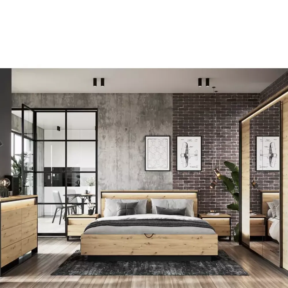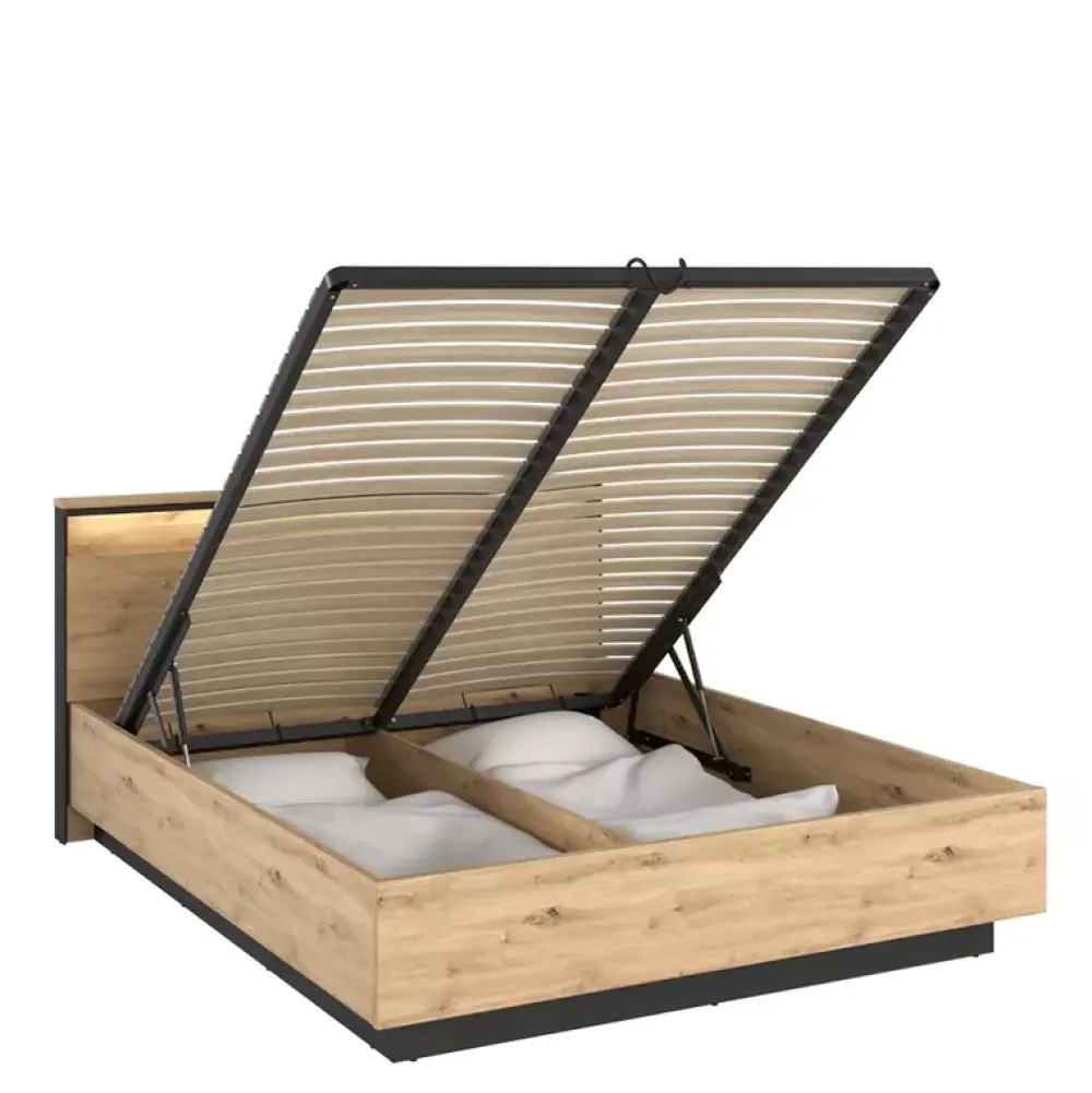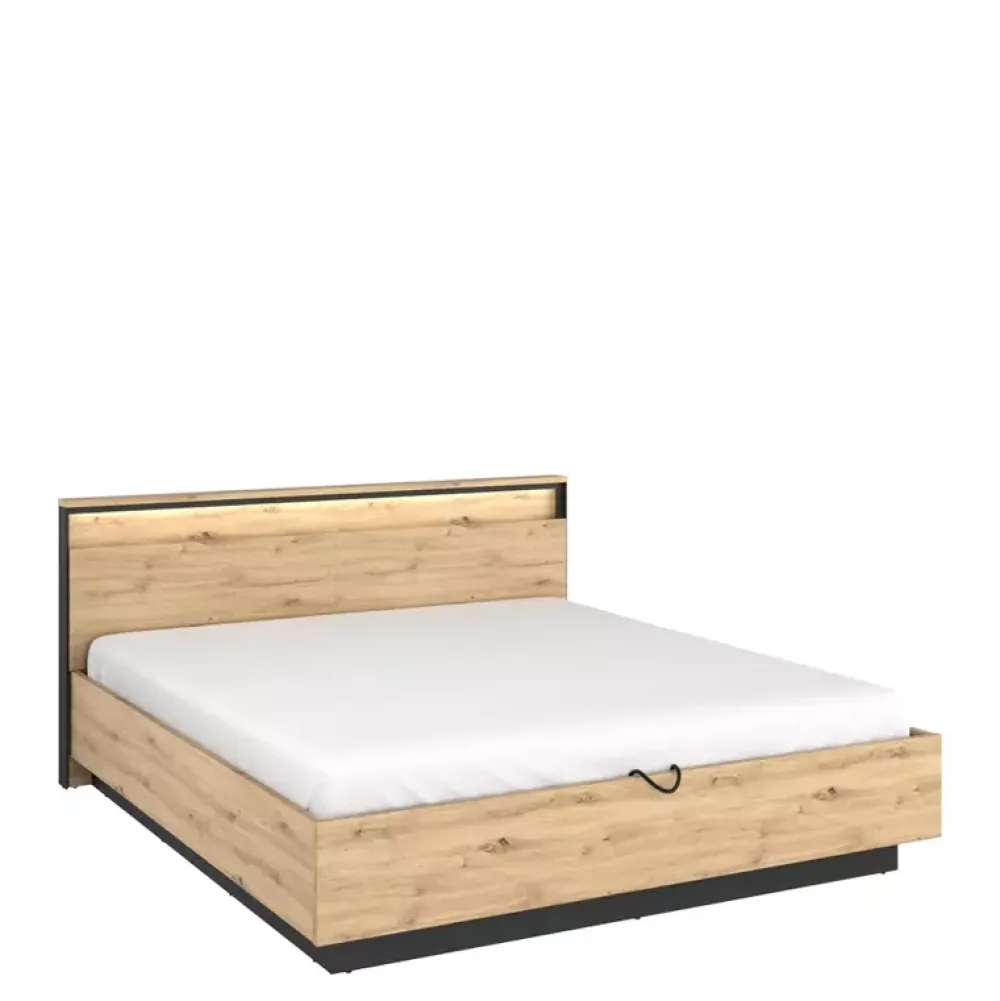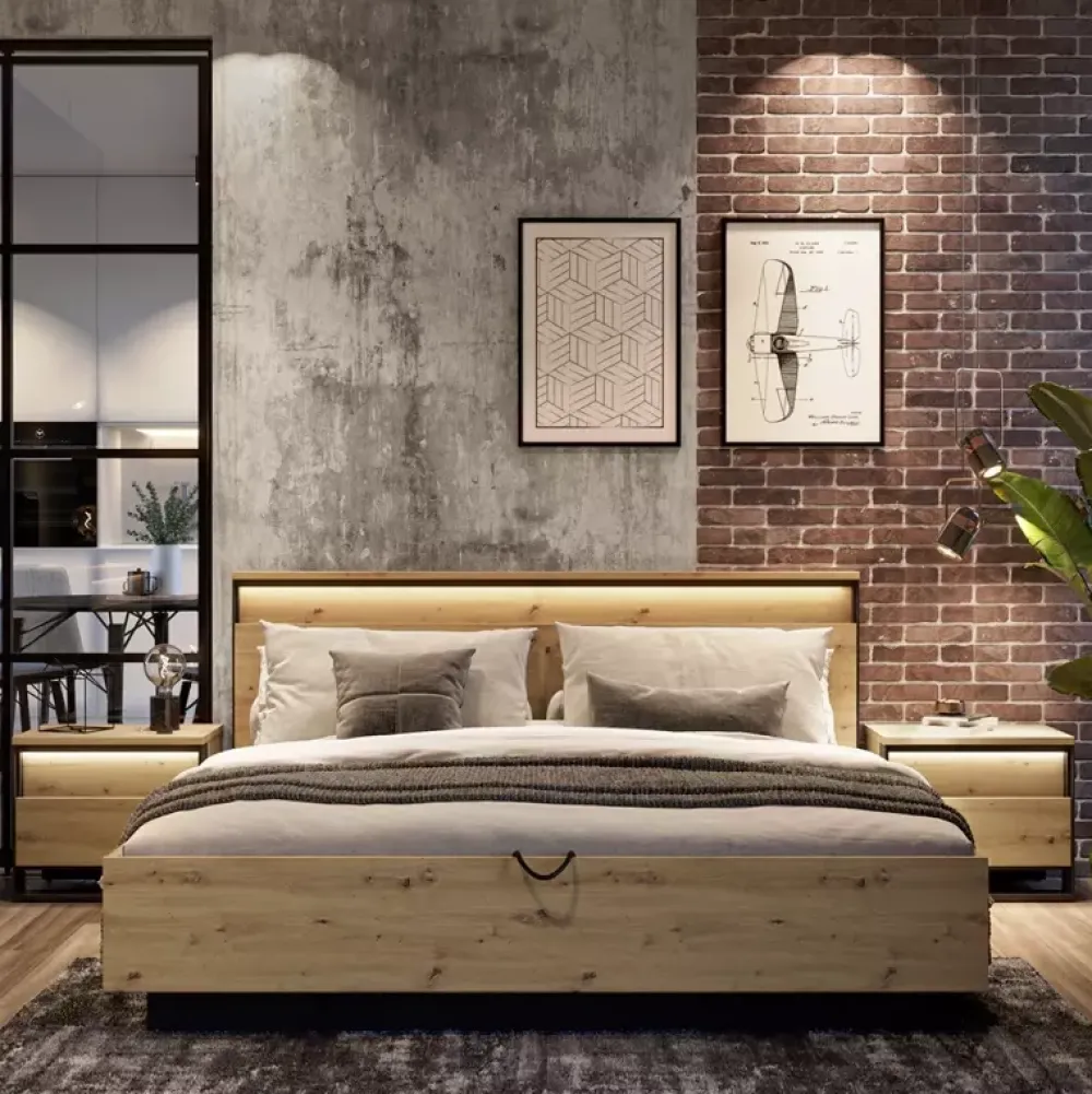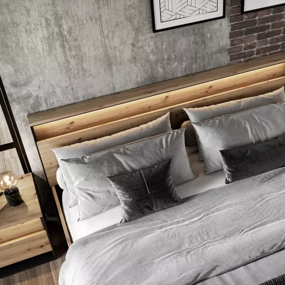 Łózko posiada również zagłówek z podświetleniem LED znajdującym się w standardzie, które doskonale sprawdza się podczas wieczornego czytania książki. Dodatkowo ponadczasowa loftowa stylistyka w połączeniu z nowoczesnymi akcentami i połączeniem koloru dąb artisan z kolorem czarnym sprawia że łóżko 160×200 QUANT znajduje duże uznanie wśród sypialni.
