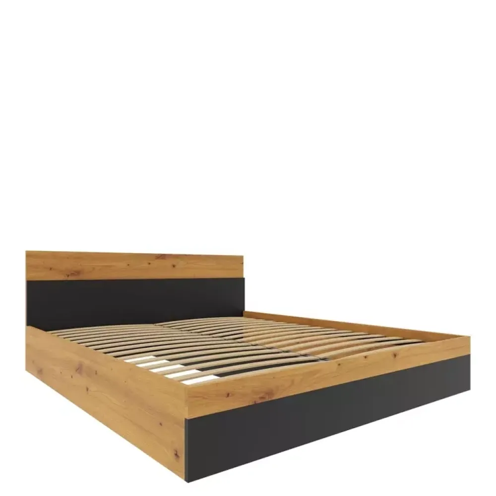 Łóżko sypialniane NELGARI to propozycja wykonana w ponadczasowej, oraz przyciągającej uwagę kolorystyce. Korpus łóżka został wykonany w kolorze dąb artisan, natomiast front i dodatki w kolorze czarnym. Łóżko posiada zagłówek oraz miejsce na materac i stelaż o powierzchni 160×200 cm, która gwarantuje komfortową ilość miejsca dla dwóch osób.