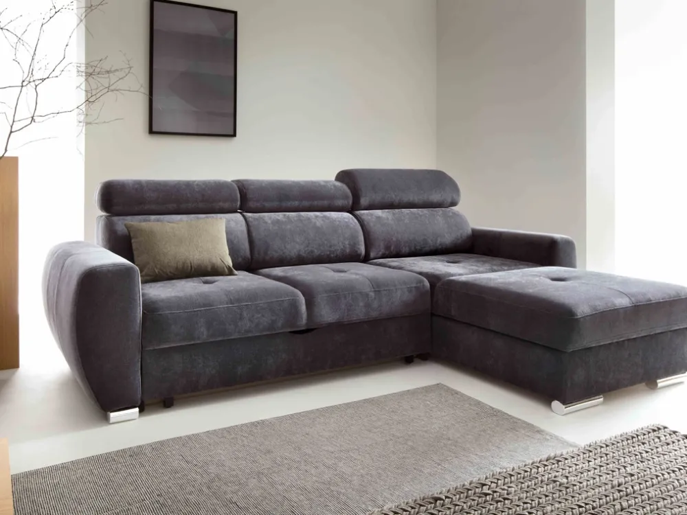 - Rozkładany narożnik z funkcją spania dorównującą swoją powierzchnią łóżkom, ponieważ wynosi aż 140 × 220 cm. Całość dopełniają regulowane zagłówki oraz duży pojemnik na pościel.