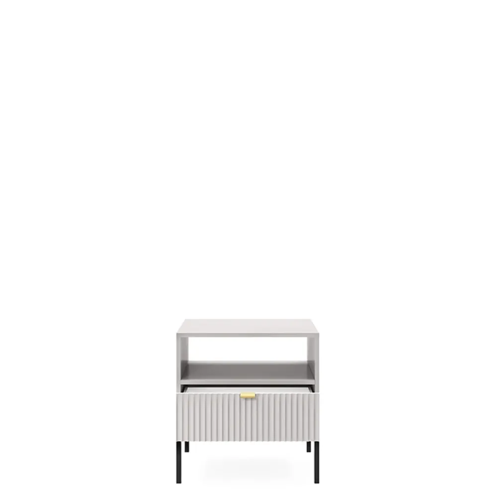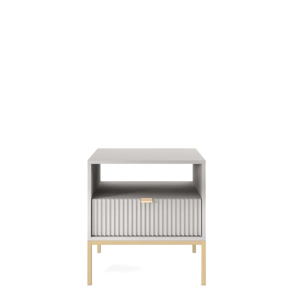 - Elegancka szafka nocna AVANTI w szarości. Styl glamour z ryflowanymi frontami MDF i złotymi nogami. Jedna szuflada i otwarta półka – praktyczna i stylowa. Idealne miejsce na nocne niezbędniki.