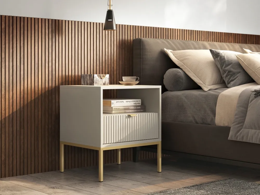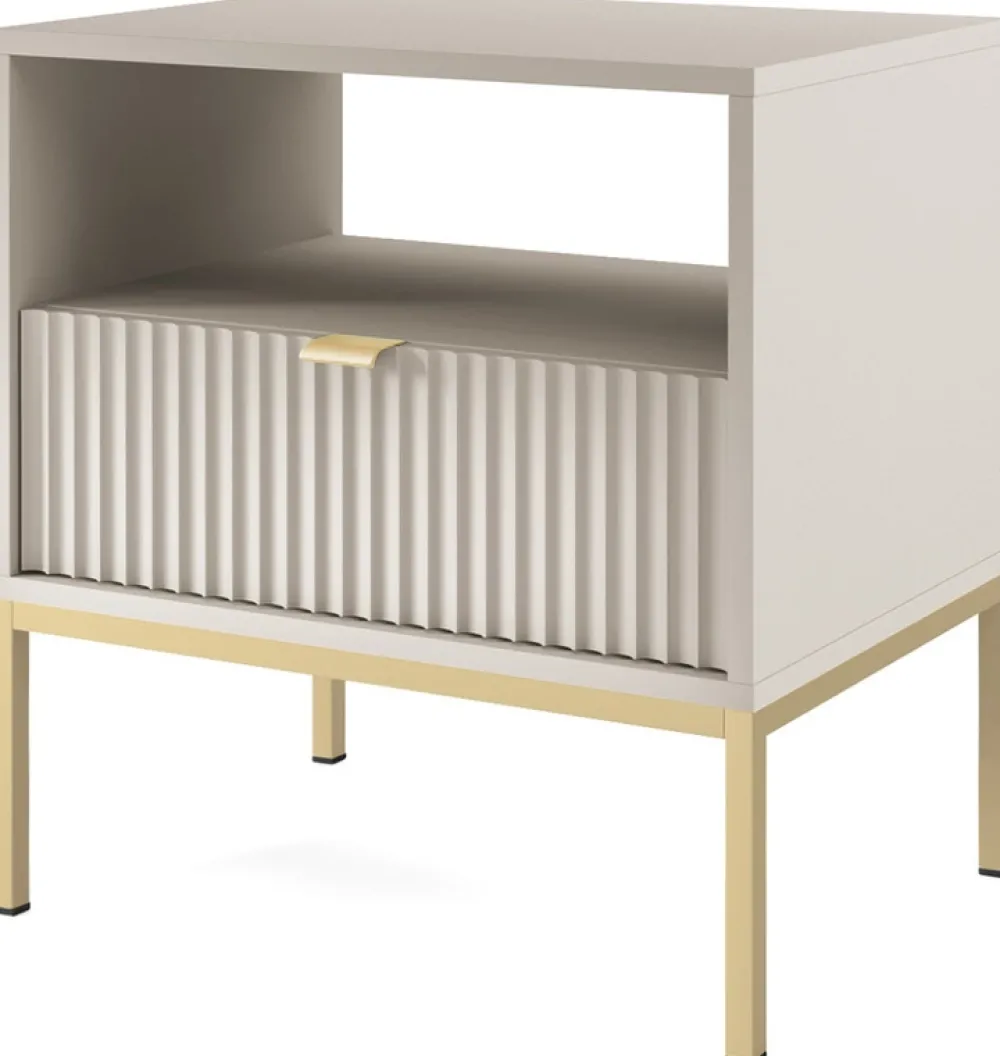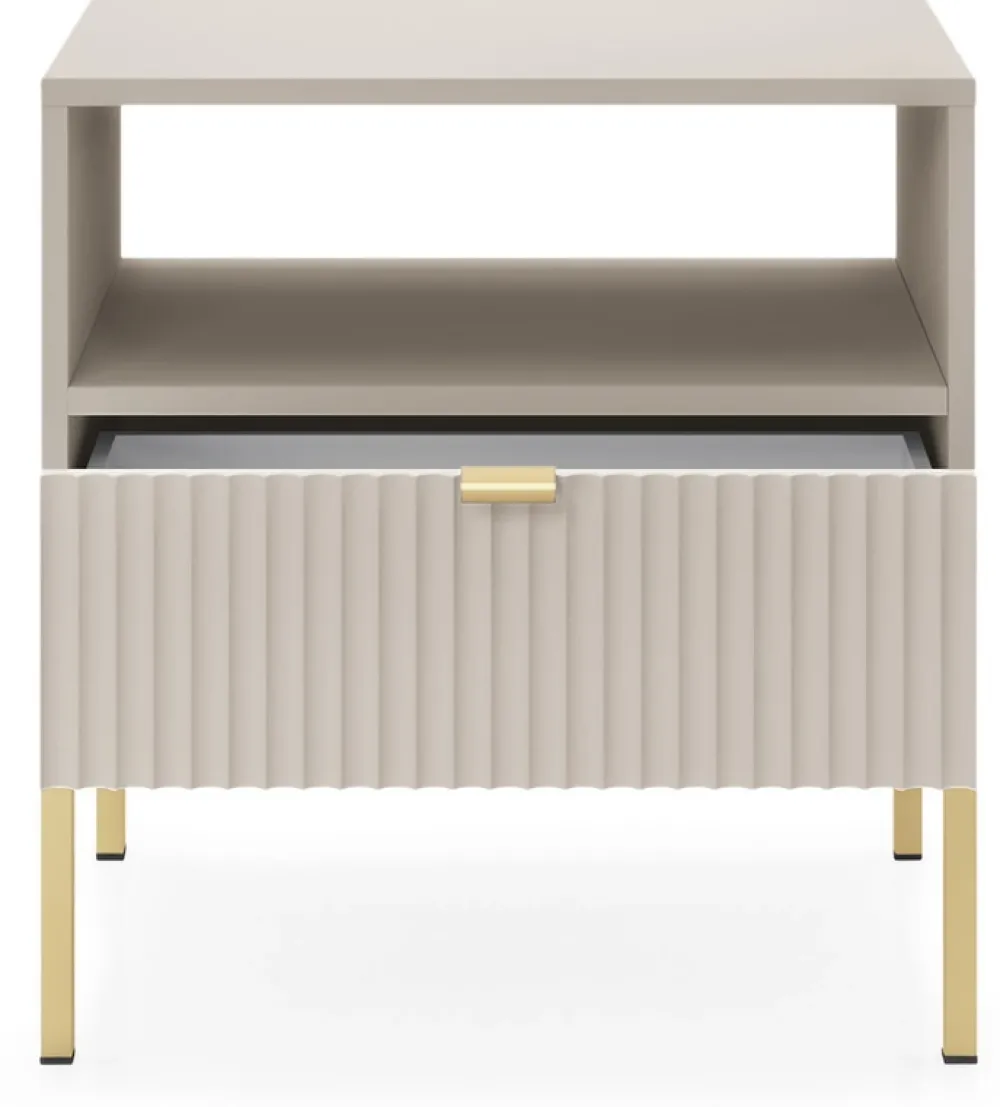 - Szafka nocna AVANTI została wyposażona w pojemną szufladę z ryflowanym frontem i aluminiowym uchwytem. Nóżki szafki nocnej wykonano z metalu w złotym kolorze. Umożliwiają one odkurzanie swobodne odkurzanie pod powierzchnią szafki.