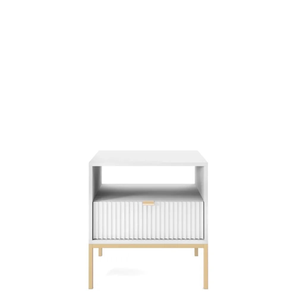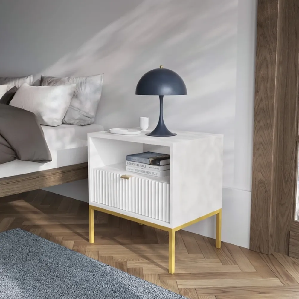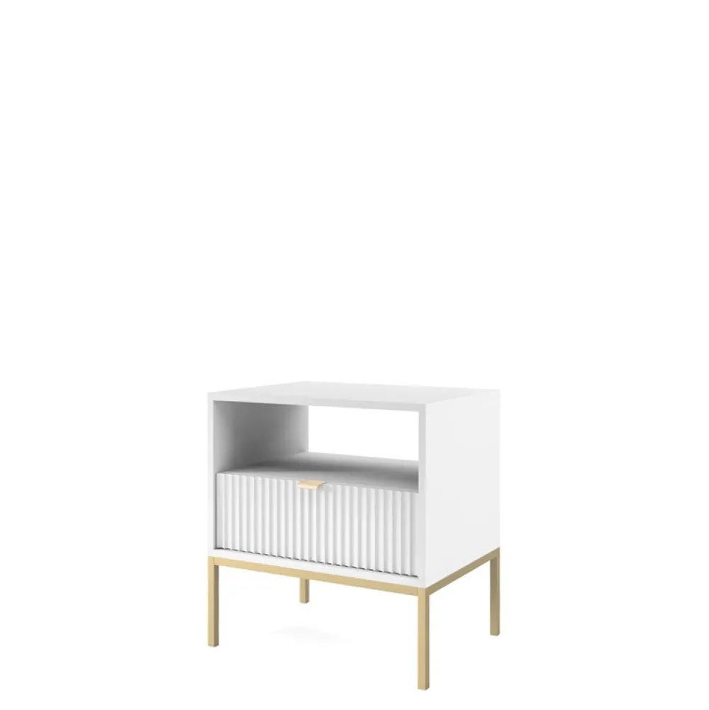 - Szafka nocna AVANTI w bieli, dla miłośników glamour. Biały, ryflowany front MDF spotyka się ze złotymi nogami. Jedna szuflada i otwarta półka zapewniają miejsce na nocne niezbędniki. Delikatna elegancja, która łączy praktyczność z luksusem.