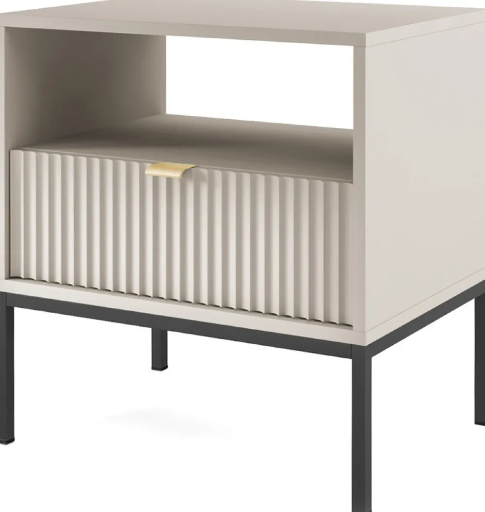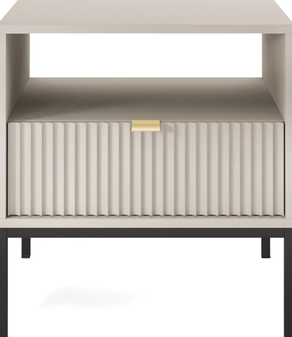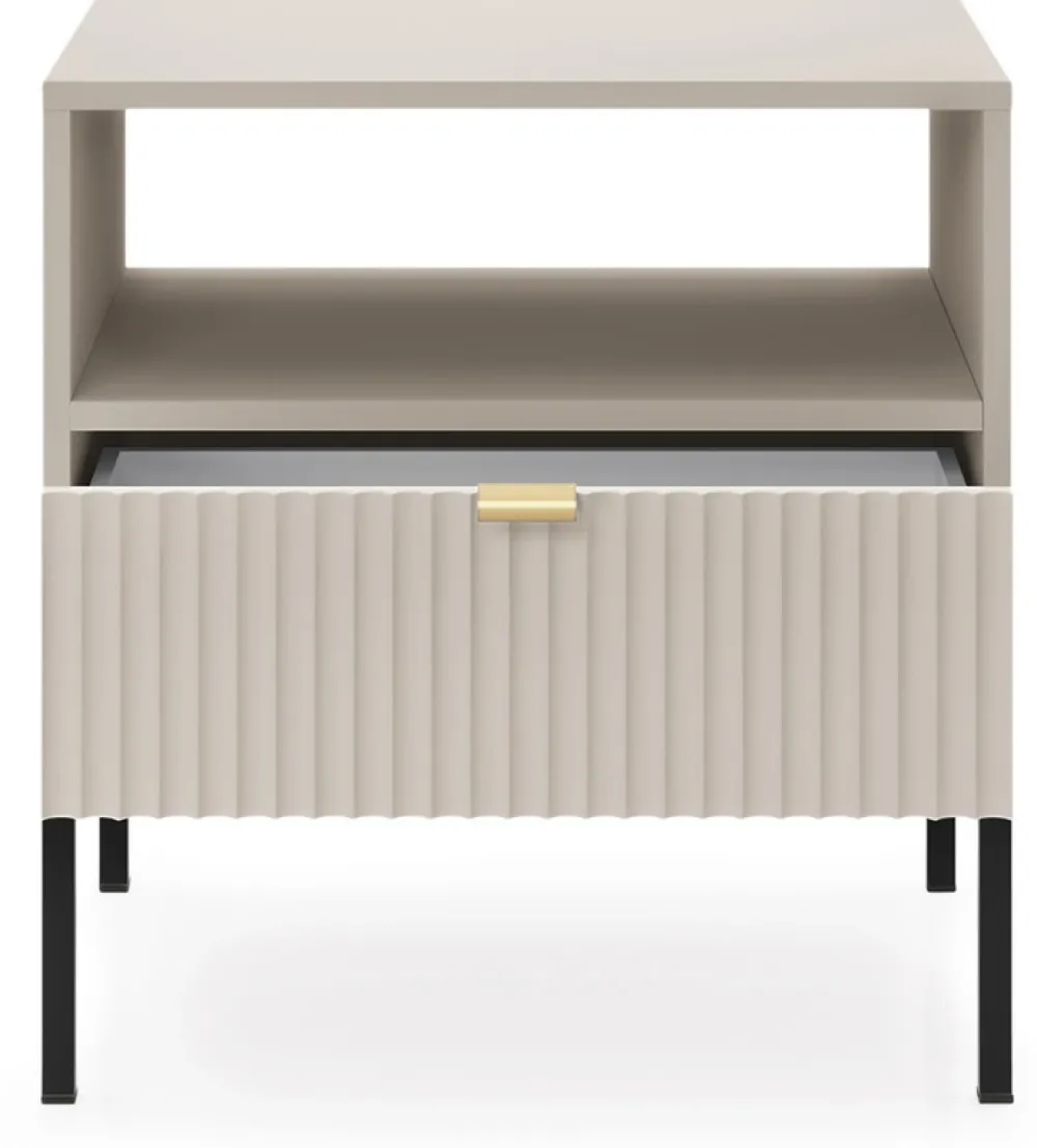 - Szafka nocna AVANTI została wyposażona w pojemną szufladę z ryflowanym frontem i aluminiowym uchwytem. Nóżki szafki nocnej wykonano z metalu w złotym kolorze. Umożliwiają one odkurzanie swobodne odkurzanie pod powierzchnią szafki.