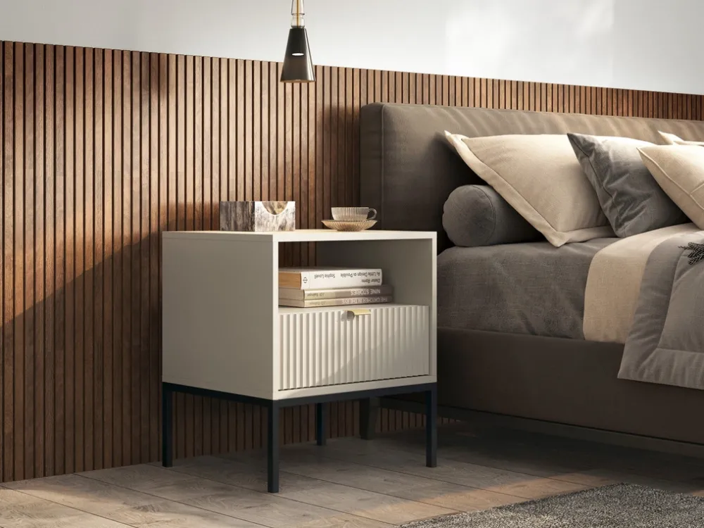 Nowoczesna szafka nocna AVANTI łączy w sobie elegancję i funkcjonalność, idealnie wpisując się w każde współczesne wnętrze. Jej design charakteryzuje się prostymi, ale wyrafinowanymi liniami, które przyciągają wzrok i dodają przestrzeni klasy.