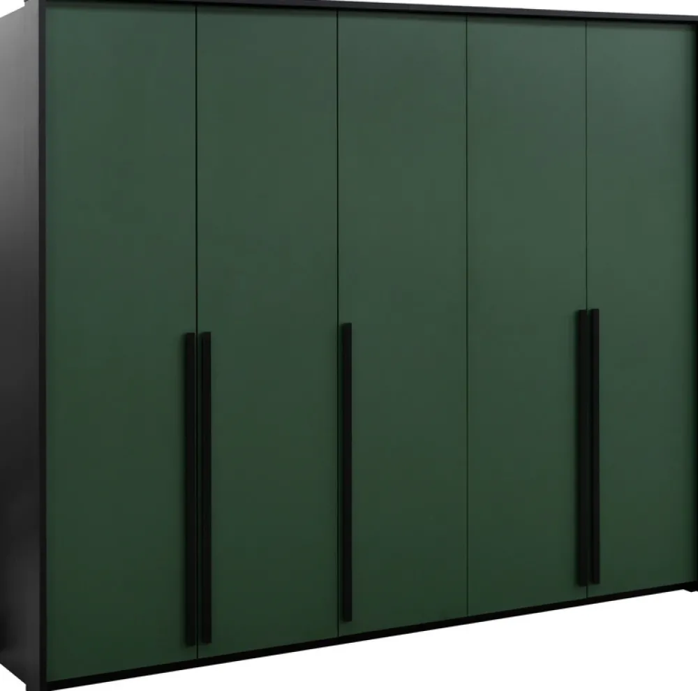 Szafa wyposażona jest w pięć drzwi z systemem cichego domyku, który gwarantuje płynne i bezgłośne zamykanie. To praktyczne rozwiązanie, które podnosi komfort użytkowania, eliminując hałas i zapewniając delikatne działanie mechanizmu zamykania.