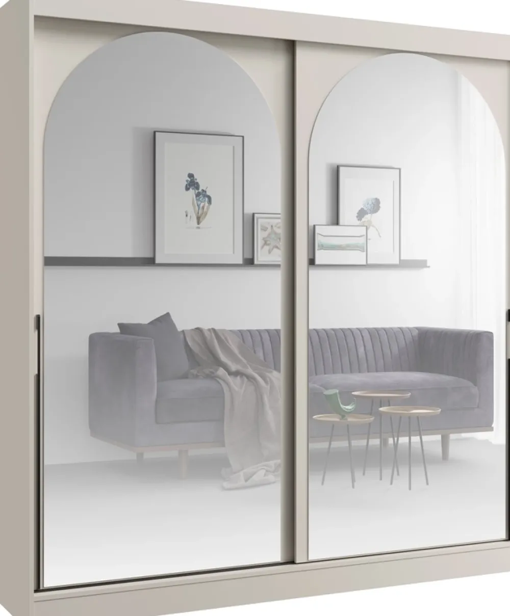 Szafa MORIN to propozycja dla tych, którzy cenią minimalistyczny design połączony z funkcjonalnością. Kaszmirowe fronty z efektownymi lustrami o łukowym wykończeniu dodają wnętrzu przestronności i światła, a system przesuwny zapewnia wygodne użytkowanie nawet w mniejszych pomieszczeniach. Idealna do sypialni, garderoby czy przedpokoju – wszędzie tam, gdzie liczy się styl i porządek.