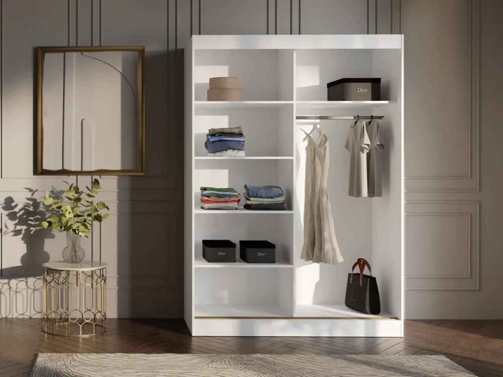 Wnętrze szafy MORIN zostało zaprojektowane z myślą o maksymalnej funkcjonalności – praktyczne półki i drążek na ubrania ułatwiają organizację garderoby i pozwalają utrzymać porządek. Lustrzane fronty nie tylko pełnią funkcję użytkową, ale też pełnią rolę dekoracyjną, dodając pomieszczeniu nowoczesnego charakteru. Solidna konstrukcja i wykończenie z dbałością o detale sprawiają, że szafa MORIN to inwestycja na lata.