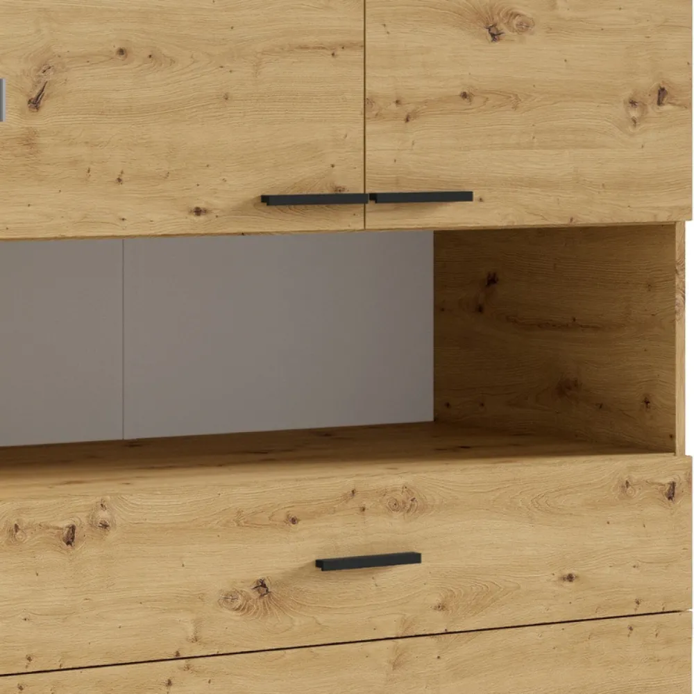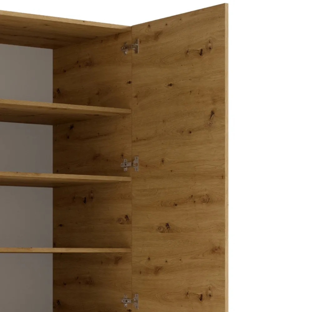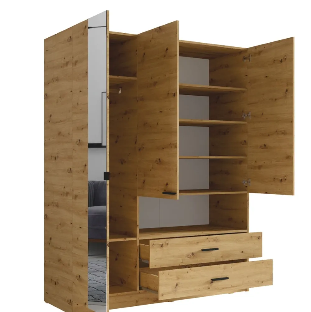 Szafa z lustrem TIVARO to idealne rozwiązanie dla osób, które szukają praktycznego i eleganckiego mebla do przechowywania. Dzięki przemyślanemu układowi półek, drążkowi na wieszaki oraz dwóm pojemnym szufladom, zapewnia wygodne miejsce na ubrania, akcesoria i domowe drobiazgi. Nowoczesny design w naturalnym odcieniu drewna sprawia, że szafa doskonale wpasowuje się w każde wnętrze – od sypialni po przedpokój.