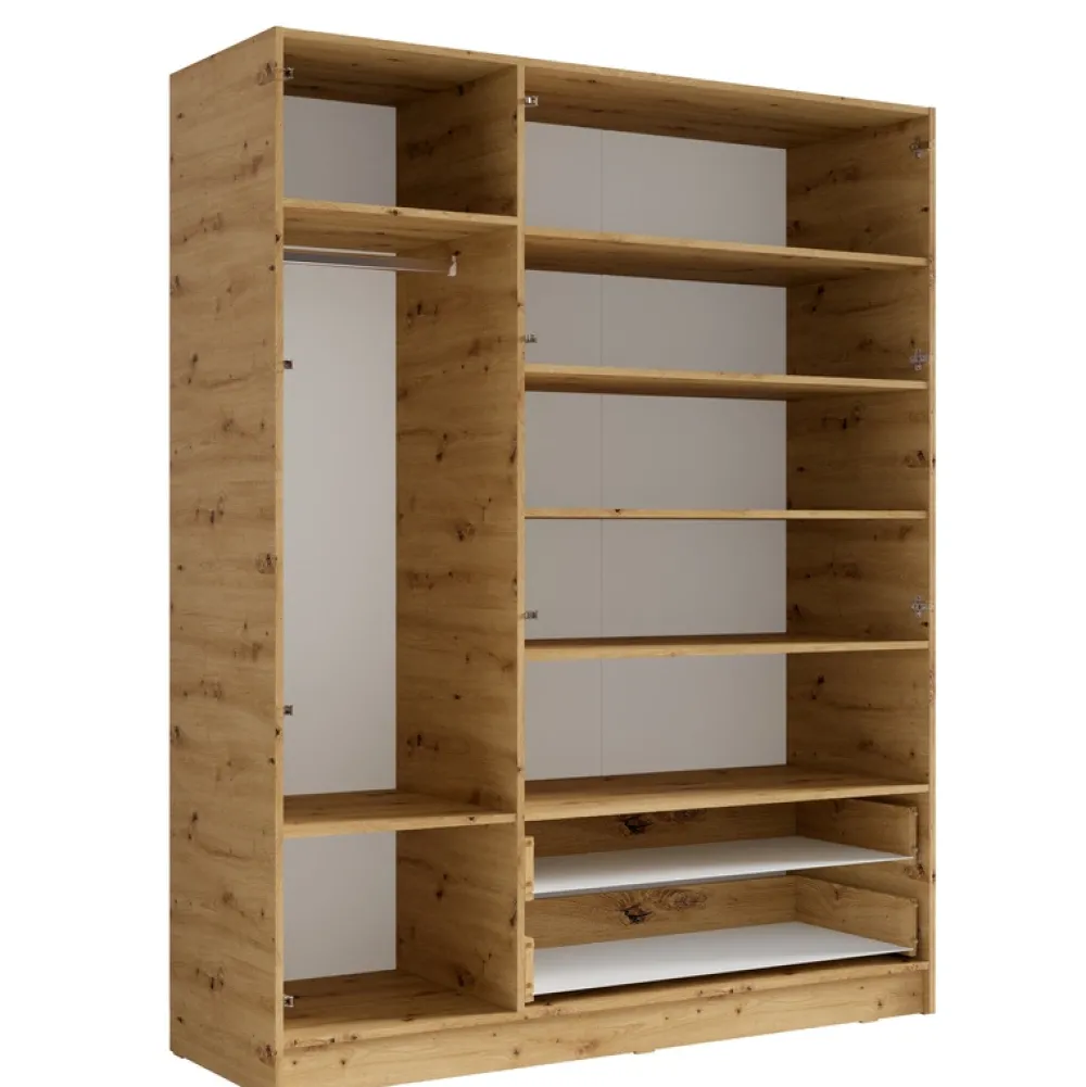 - Szafa TIVARO 158,3 × 54,9 × 200,6 cm z lustrem, sześcioma półkami, drążkiem i dwiema szufladami na prowadnicach rolkowych. Wykonana z płyty laminowanej 16 mm, front z lustrem 3 mm, obrzeża ABS. Kolor dąb artisan. Idealna do sypialni lub przedpokoju.