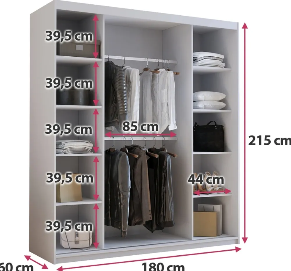 - Wymiary: szerokość 180 cm, wysokość 215 cm, głębokość 60 cm