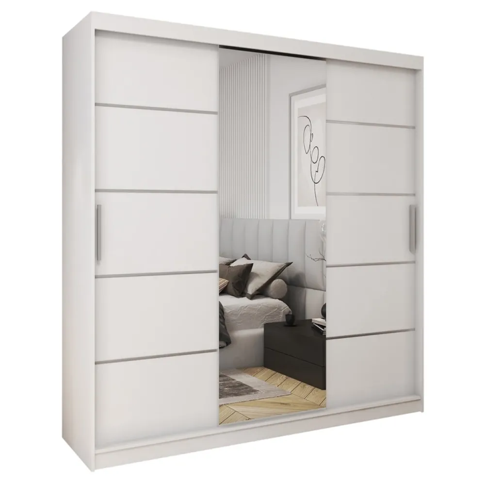 Model HOT to idealna szafa do nowoczesnych przestrzeni, gdzie liczy się każdy centymetr. Dzięki aluminiowym prowadnicom drzwi przesuwają się lekko i cicho, co zwiększa komfort codziennego użytkowania. Zintegrowane lustro nie tylko ułatwia poranne przygotowania, ale też pełni rolę stylowego dodatku aranżacyjnego.