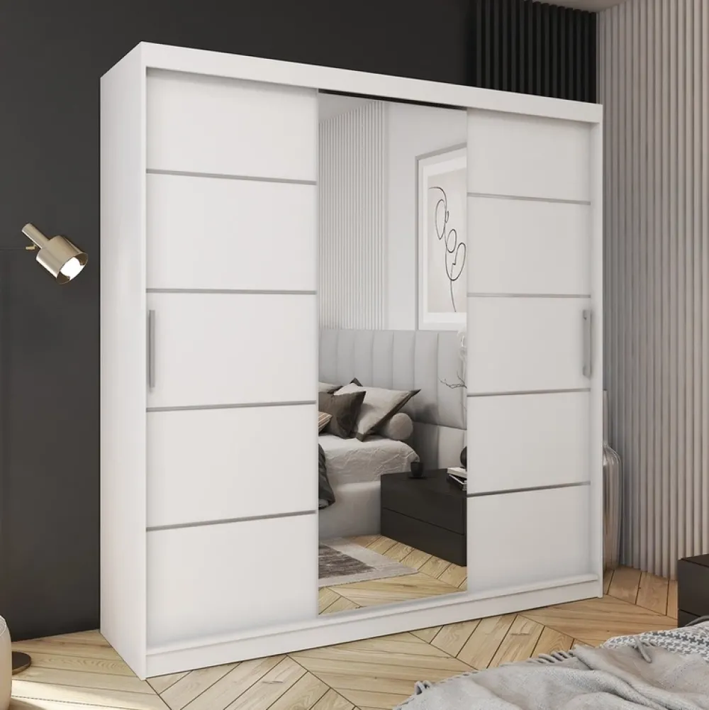 Model HOT to idealna szafa do nowoczesnych przestrzeni, gdzie liczy się każdy centymetr. Dzięki aluminiowym prowadnicom drzwi przesuwają się lekko i cicho, co zwiększa komfort codziennego użytkowania. Zintegrowane lustro nie tylko ułatwia poranne przygotowania, ale też pełni rolę stylowego dodatku aranżacyjnego.