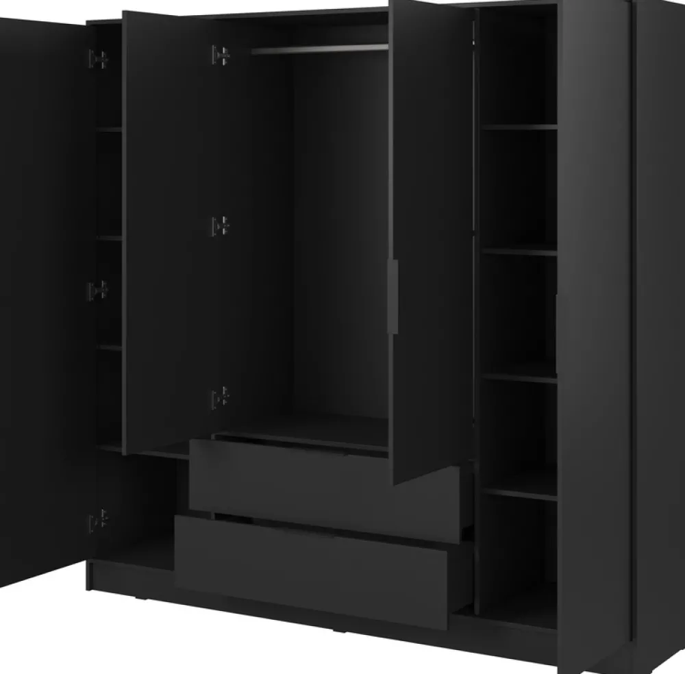 - Szafa uchylna 206 cm KAMIS posiada po pięć półek za swoimi skrajnymi drzwiami oraz drążek na wieszaki za parą środkowych drzwi. Pod środkowymi drzwiami swoje miejsce znalazły dwie pojemne szuflady poruszające się na prowadnicach kulkowych.