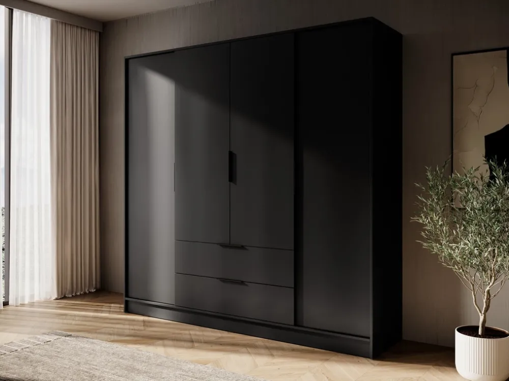 Funkcjonalność i elegancja tej szafy sprawiają, że będzie idealnym uzupełnieniem zarówno sypialni, jak i garderoby. Pojemne półki, wygodny drążek na wieszaki oraz solidne szuflady tworzą praktyczne i estetyczne rozwiązanie dla wszystkich, którzy cenią sobie porządek i piękno w swoich wnętrzach.