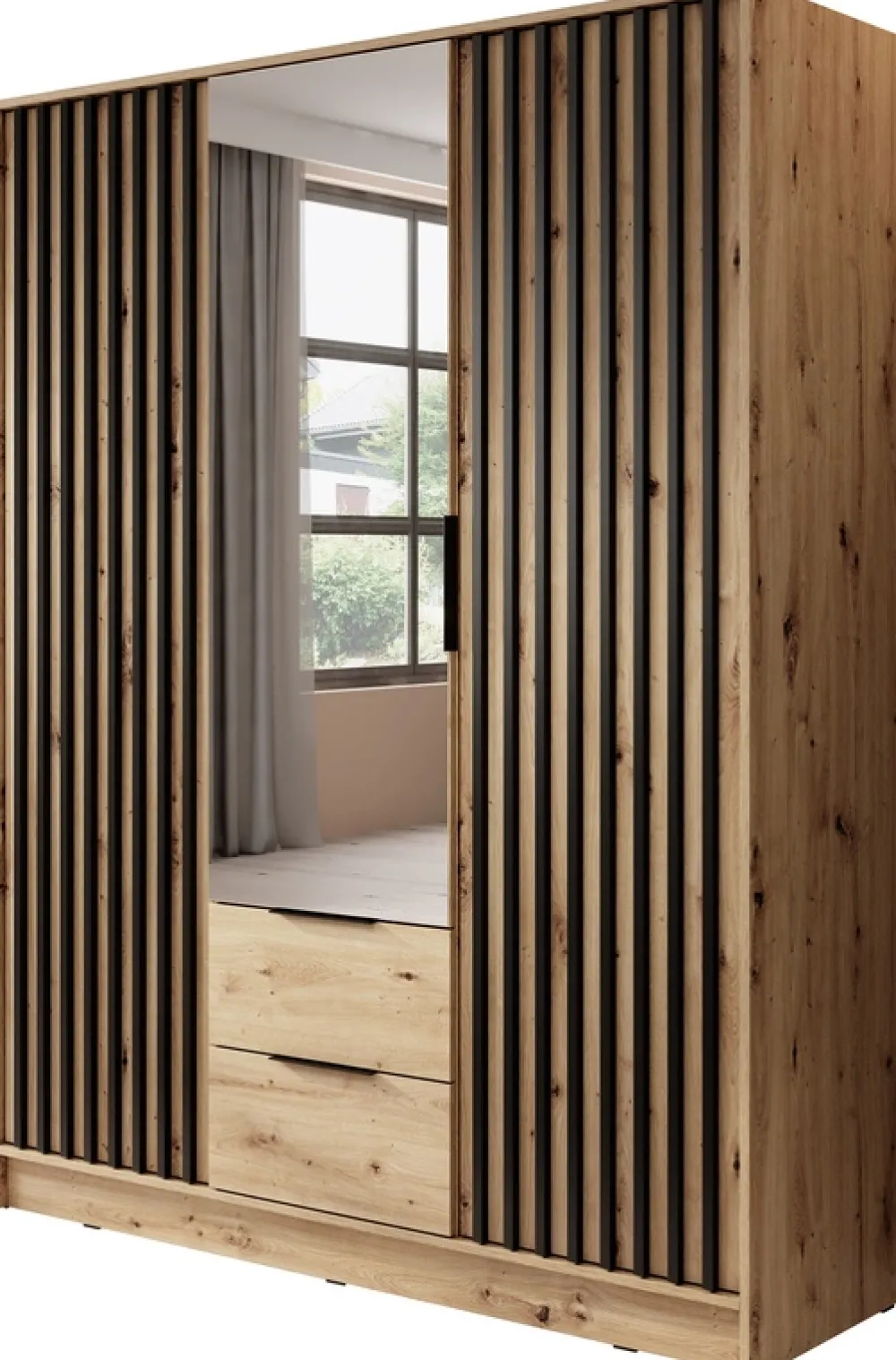 Nowoczesne lamele na drzwiach nadają szafie lekkości i wyjątkowego charakteru, a czarne metalowe uchwyty doskonale podkreślają jej stylowy wygląd. Zastosowanie odpornej na uszkodzenia okleiny ABS na obrzeżach sprawia, że mebel nie tylko pięknie się prezentuje, ale również doskonale radzi sobie z codziennym użytkowaniem.