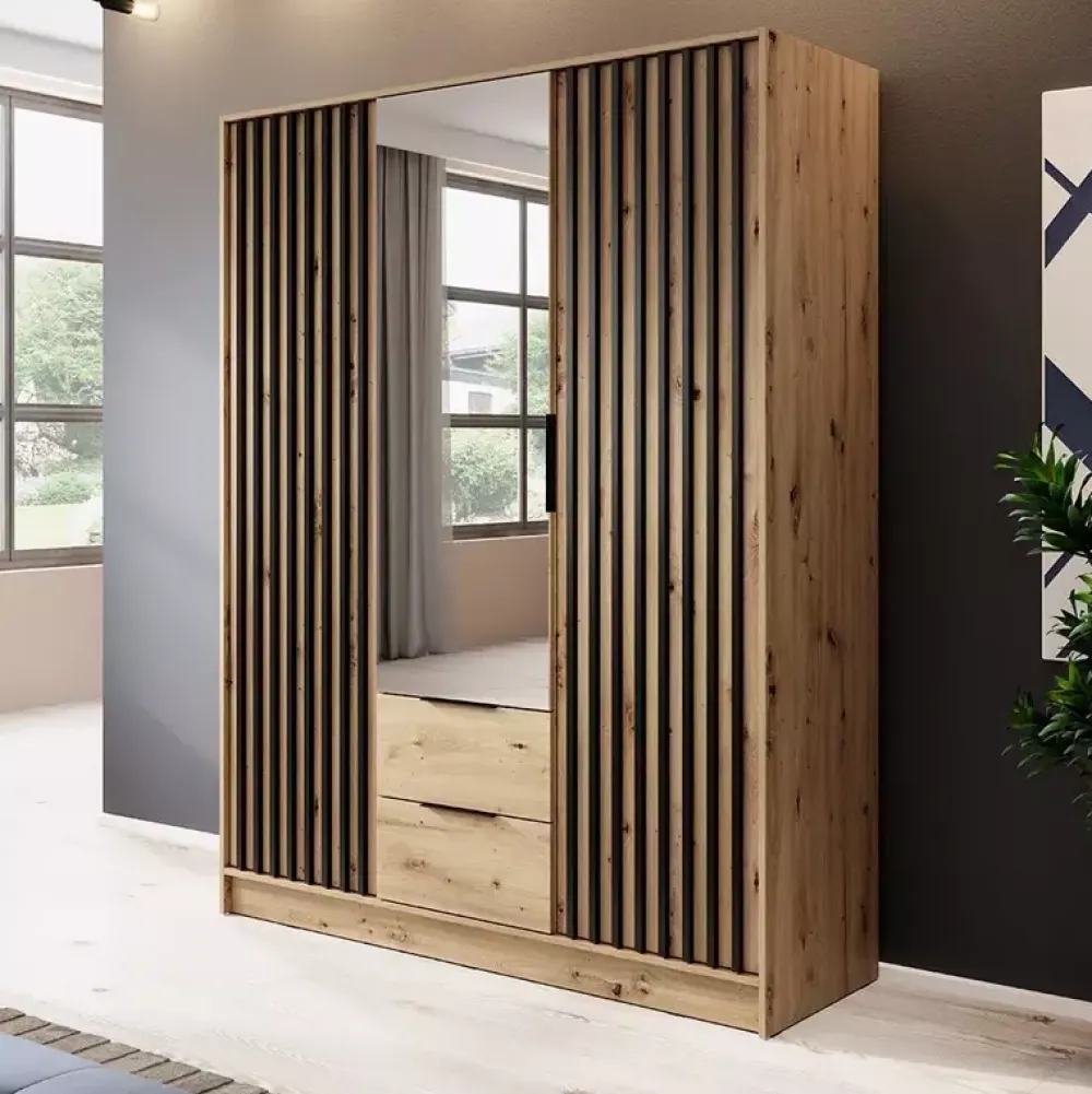 Centralna część szafy została wyposażona w drążek na wieszaki, umożliwiając przechowywanie ubrań wymagających odpowiedniego ułożenia. Dwie pojemne szuflady idealnie sprawdzą się na drobniejsze elementy garderoby lub bieliznę. Po bokach, za stylowymi drzwiami z lamelami, ukryto aż dziesięć półek, oferujących mnóstwo miejsca na swetry, koszulki i dodatki.