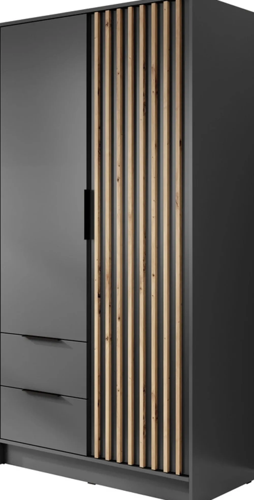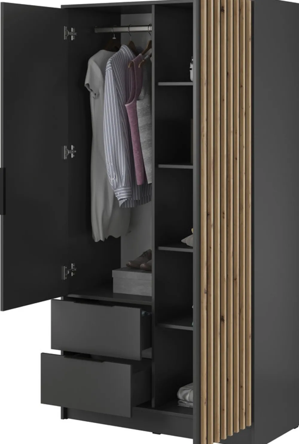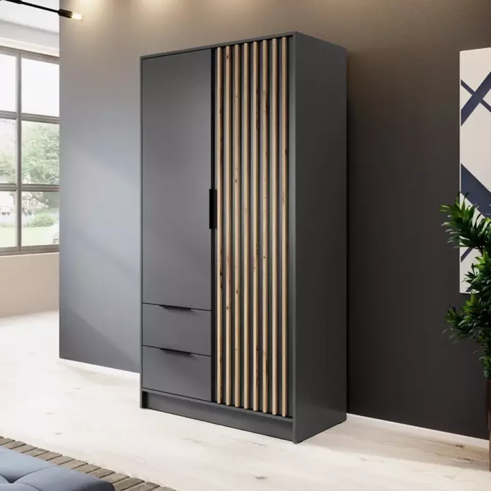 - Szafa uchylna 105 cm KELLY posiada dwie szuflady z prowadnicami kulkowymi u dołu, oraz drzwi po lewej stronie, za którymi znajduje się drążek na wieszaki i pięć półek za drzwiami z lamelami po prawej stronie. Metalowe czarne uchwyty.