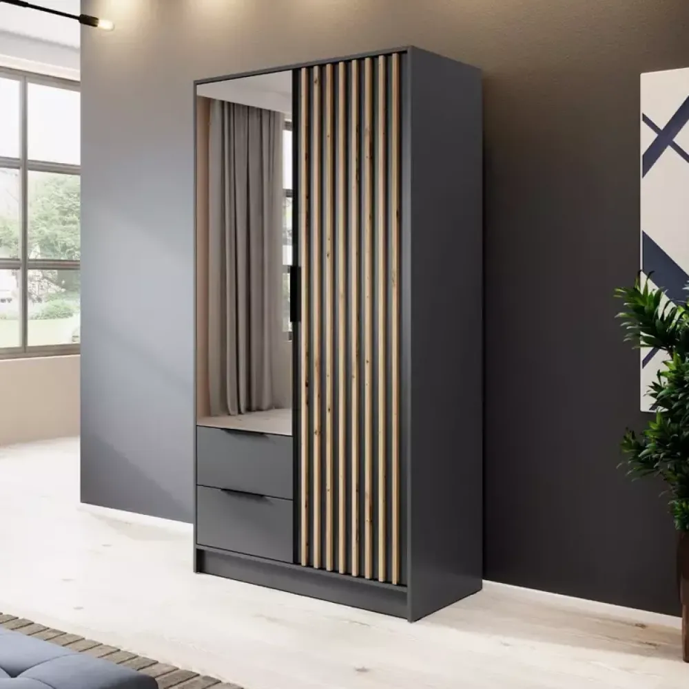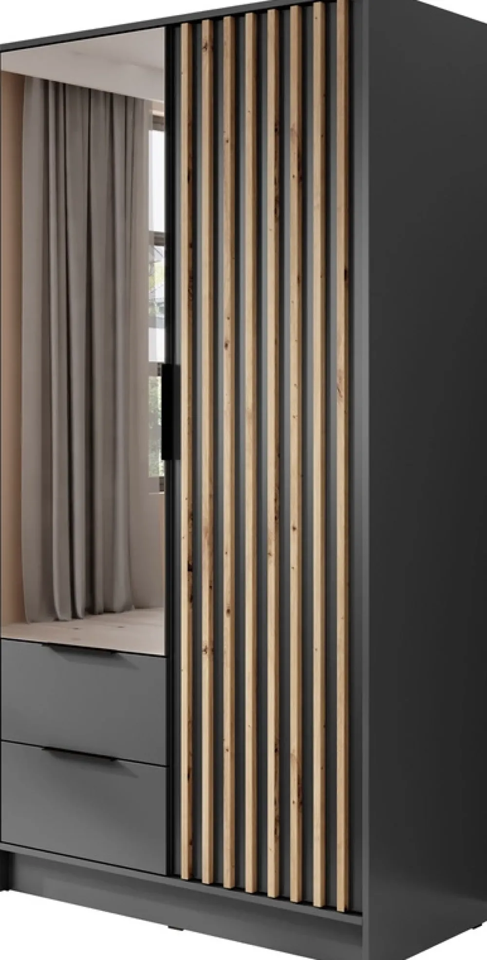 - Szafa uchylna 105 cm KELLY posiada dwie szuflady z prowadnicami kulkowymi u dołu, oraz drzwi po lewej stronie, za którymi znajduje się drążek na wieszaki i pięć półek za drzwiami z lamelami po prawej stronie. Metalowe czarne uchwyty.