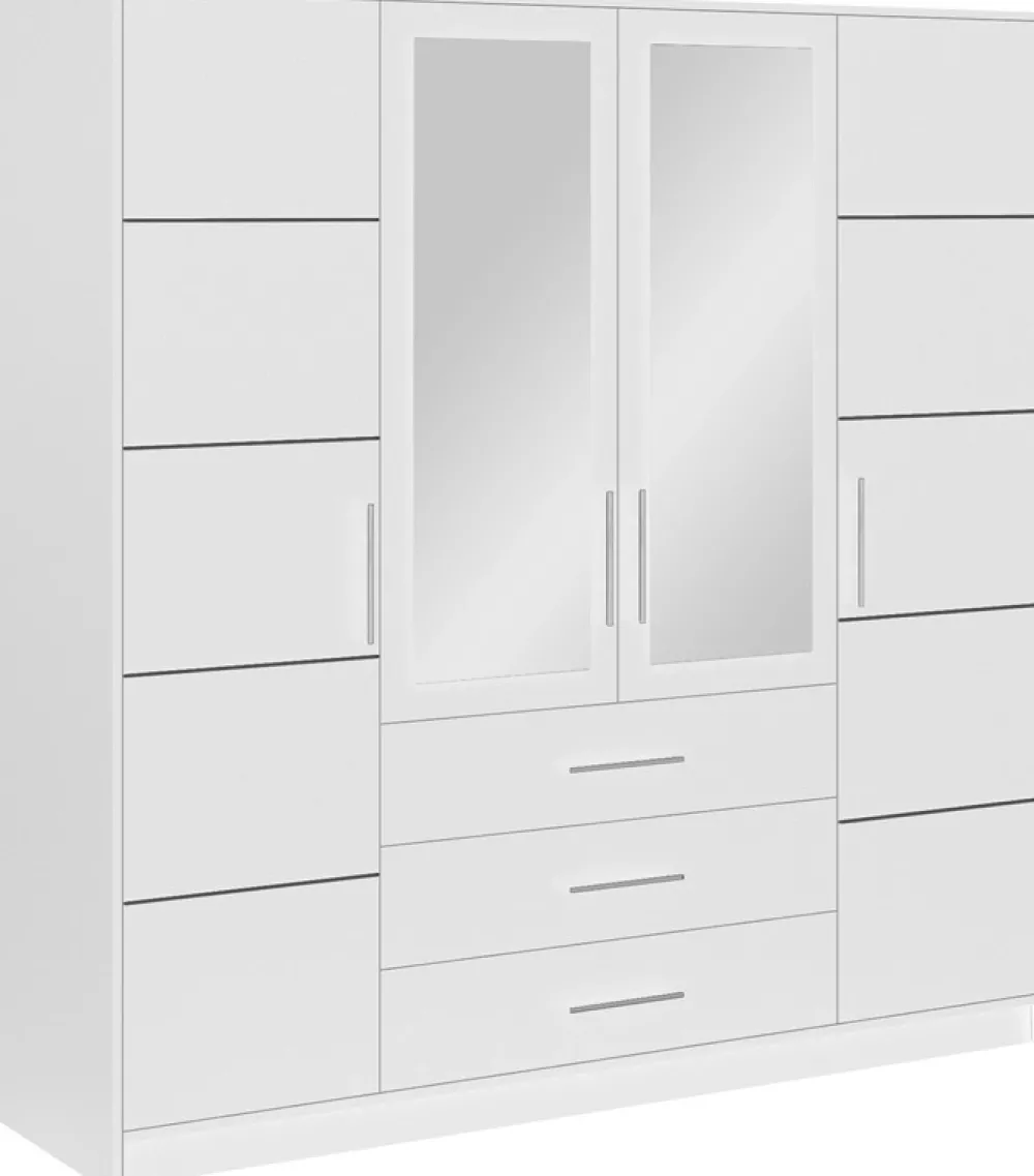 - Szafa uchylna 200 cm BILL posiada pięć półek za drzwiami po prawej i lewej stronie oraz drzwi z lustrem w swojej centralnej części, za którymi znajduje się drążek na wieszaki. U dołu swoje miejsce znalazły trzy pojemne szuflady na bieliznę.