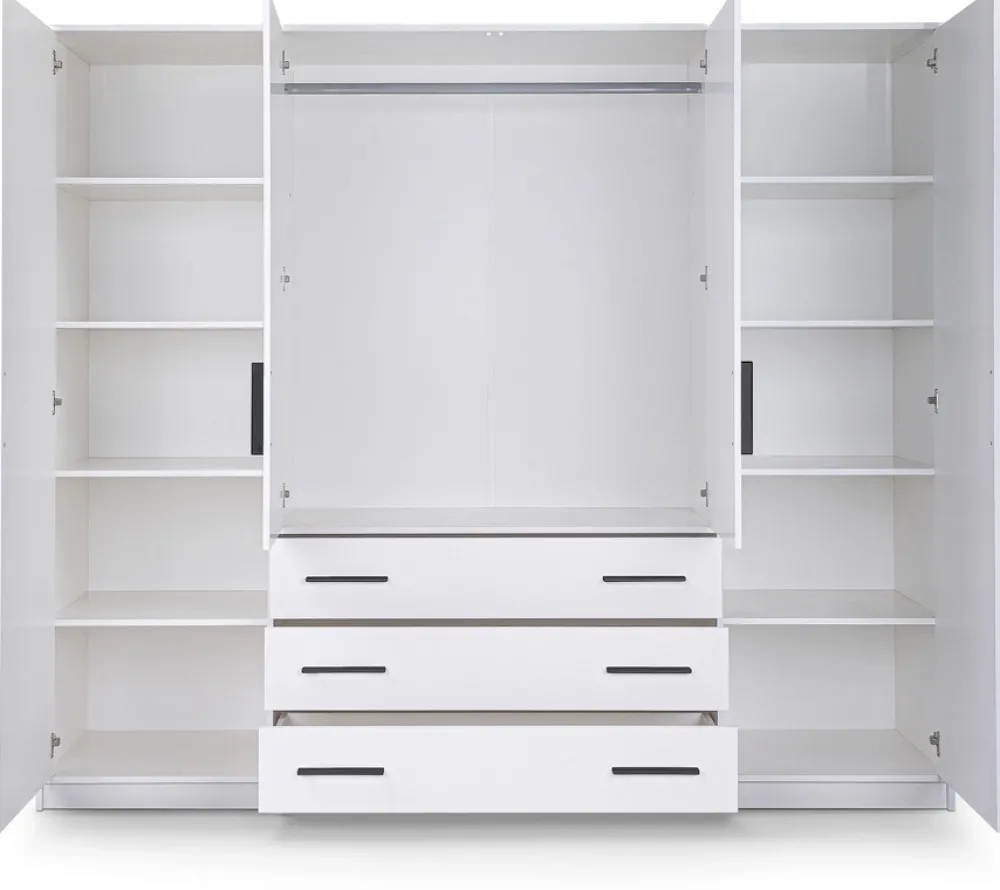 W centralnej części szafy znajduje się para drzwi, za którymi umieszczony jest drążek na wieszaki. To idealne miejsce na kurtki, płaszcze czy sukienki, które wymagają odpowiedniego przechowywania. Dzięki temu układowi wszystkie Twoje ubrania będą zawsze schludnie rozwieszone i łatwo dostępne.