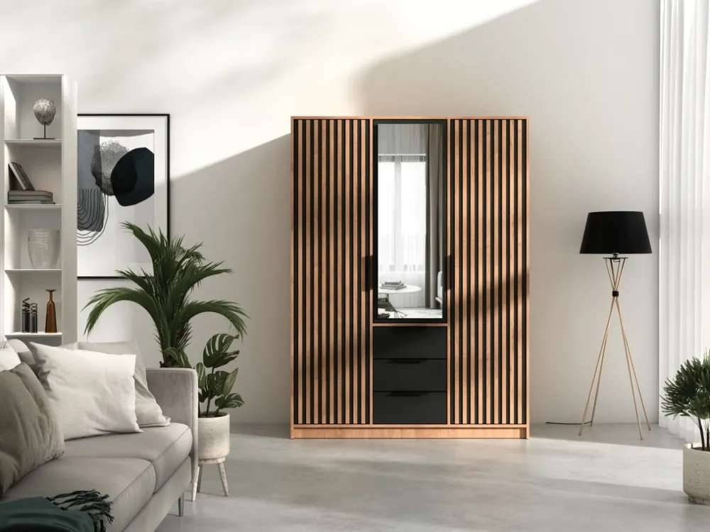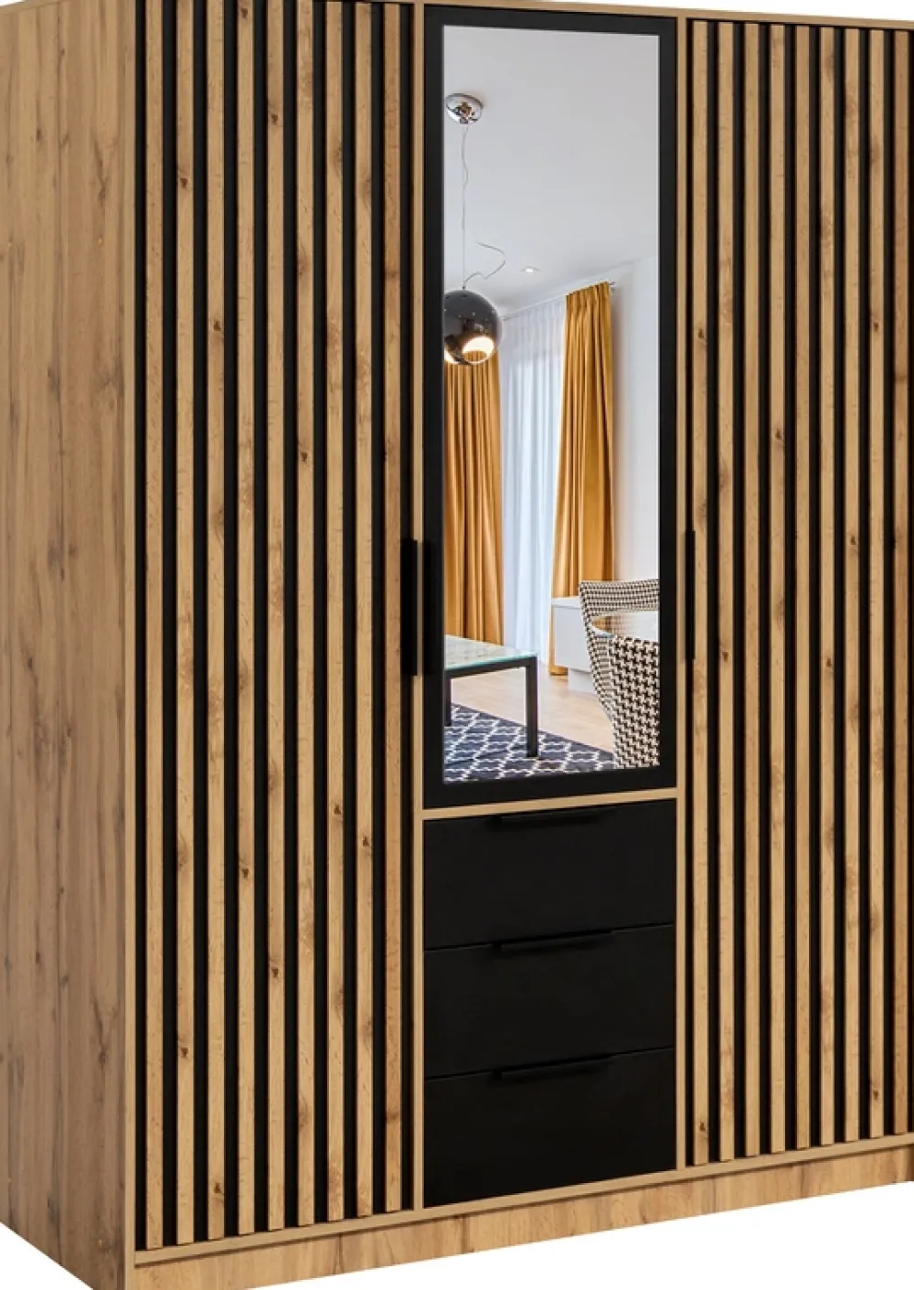 - Szafa trzydrzwiowa z lamelami 150 cm BILL posiada parę drzwi, za drzwiami po lewej i prawej stronie znajduje się półka i drążek na wieszaki, w centralnej części znajdują się trzy szuflady i trzy półki. Drzwi szafy zostały wzbogacone o cichy domyk.