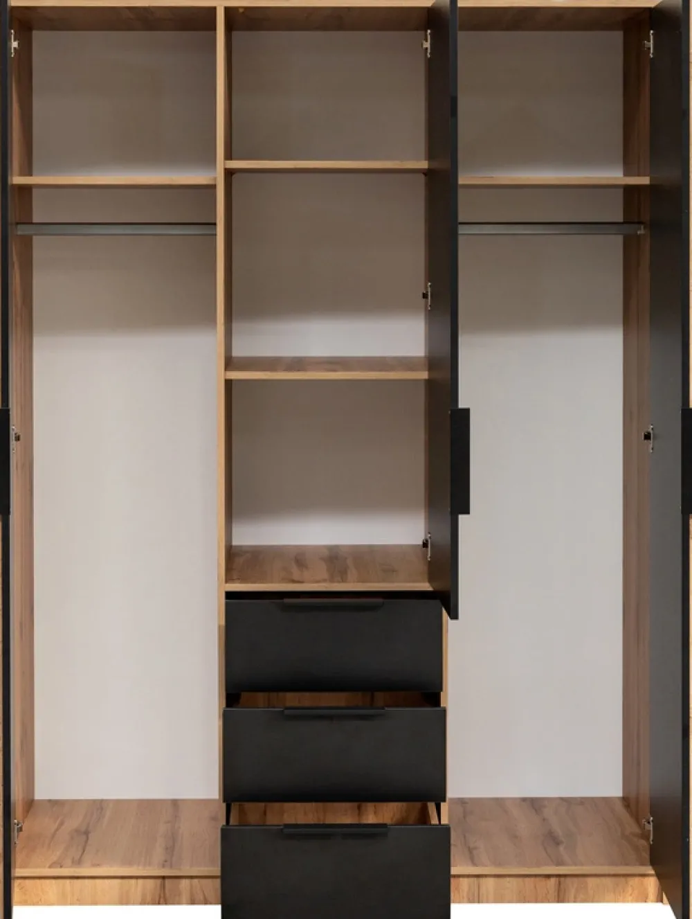 Pod środkowymi drzwiami znajdziesz trzy pojemne szuflady, które doskonale nadają się do przechowywania drobnych przedmiotów, takich jak bielizna, skarpetki czy inne akcesoria, które chcesz mieć zawsze pod ręką. Szuflady oferują dodatkowe miejsce do przechowywania, jednocześnie zachowując porządek w szafie.
