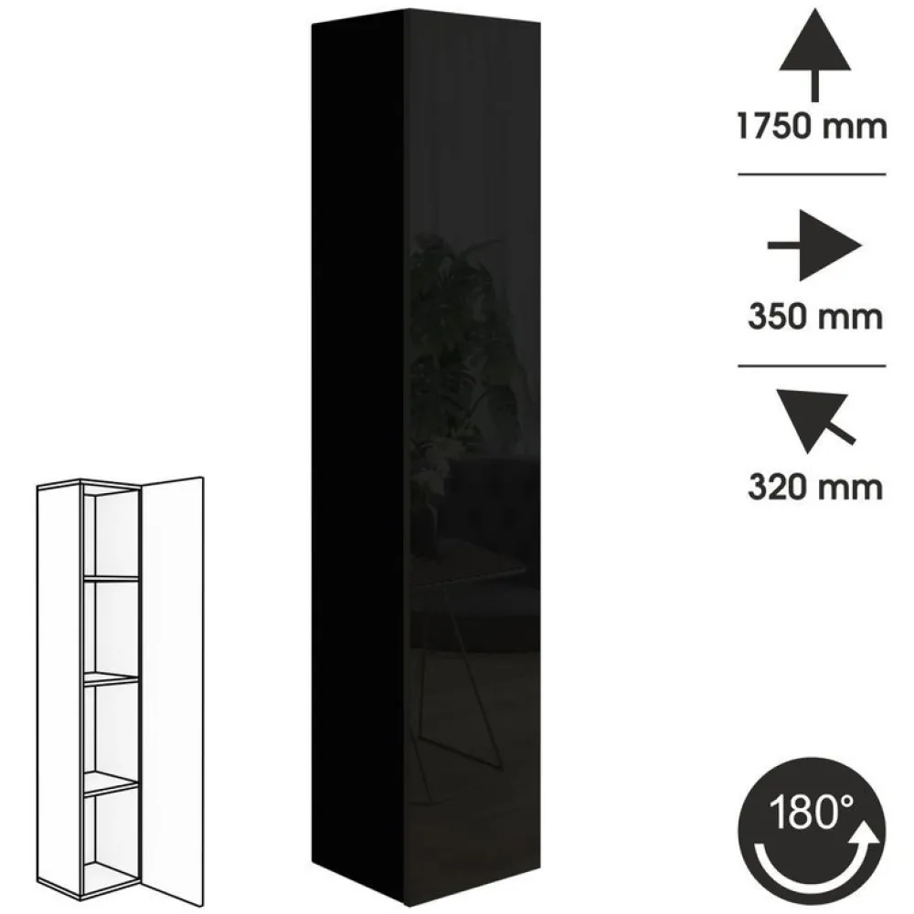Zamykana szafka wisząca o szerokości 35 cm i wysokości 175 cm z trzema półkami.