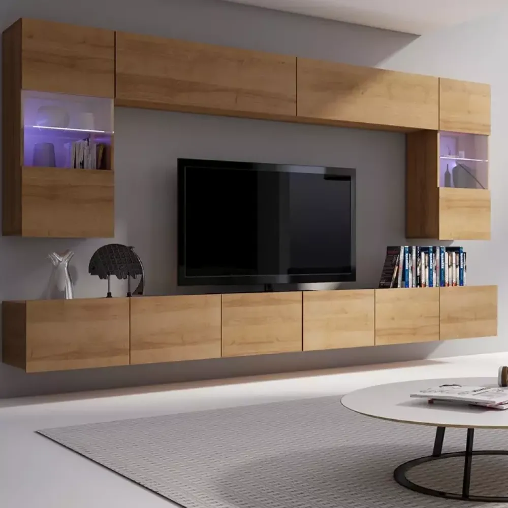 Zestaw mebli MODERN w kolorze dąb złoty to idealna propozycja do salonu, który ma być zarówno estetyczny, jak i praktyczny. Komplet składa się z dwóch pojemnych szafek RTV (150 cm), dwóch poziomych szafek wiszących oraz dwóch wysokich witryn z przeszkleniami, które pięknie wyeksponują dekoracje i dodadzą lekkości całej aranżacji.