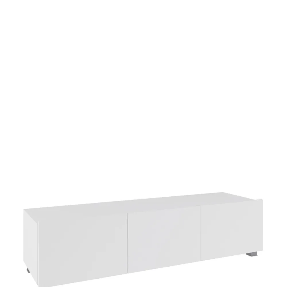 - Trzydrzwiowa szafka pod telewizor o szerokości 150 cm. Szafka jest uniwersalna, ponieważ można ją zawiesić lub postawić na załączonych stopkach. Mebel wykonany w nowoczesnym stylu.