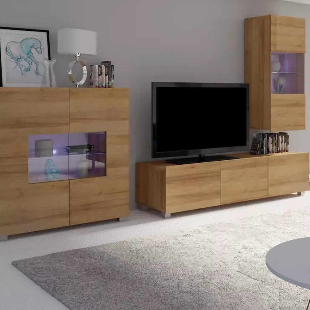 Zestaw mebli MODERN to idealne rozwiązanie dla osób ceniących minimalistyczny design, funkcjonalność i nowoczesny wygląd. W skład kolekcji wchodzi elegancka komoda z witryną, praktyczna szafka RTV o szerokości 150 cm oraz stylowa witryna wisząca z opcją podświetlenia LED. Dzięki spójnemu wzornictwu i wysokiej jakości wykonania, meble MODERN doskonale sprawdzą się zarówno w jasnych, jak i ciemniejszych aranżacjach salonu, pokoju młodzieżowego czy sypialni.