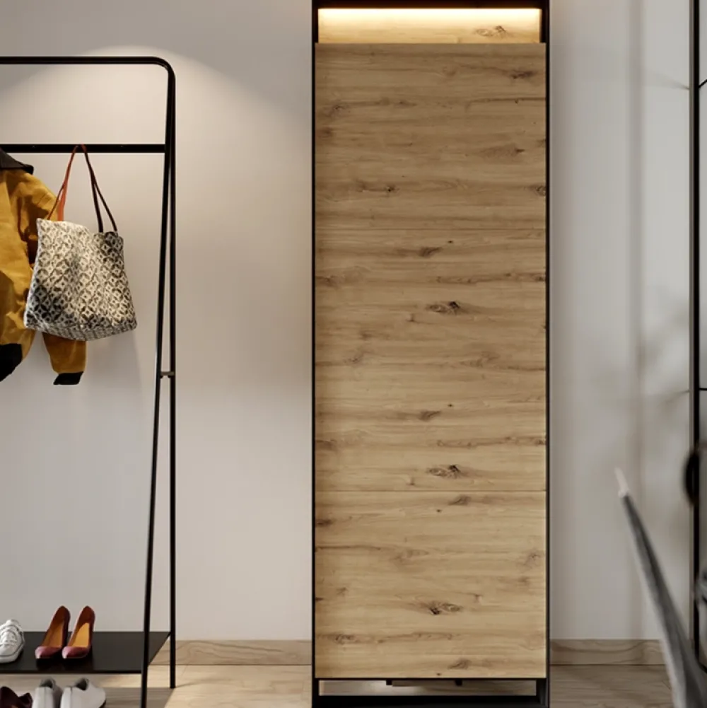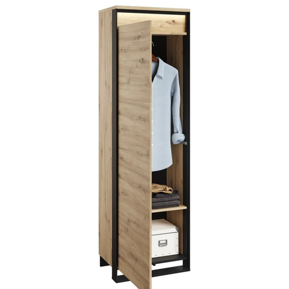 - Szafa QUANT posiada drzwi osadzone na zawiasach puszkowych z bezuchwytowym mechanizmem otwierania push to open. Za drzwiami szafy znajduje się półka oraz drążek na wieszaki. Szafa posiada subtelne oświetlenie LED u góry.